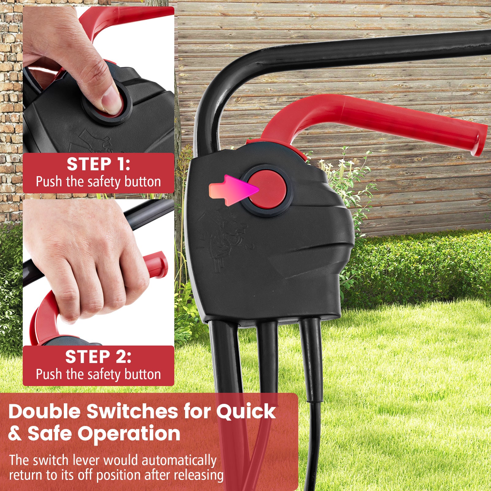 ● Double Guarantee of Security: Designed with a dual safety switch this lawn mower features safe use with simple operation. Specifically the machine can only be started when you press the safety button and pull the switch lever together. In addition the self locking function can cut down the power to prevent over heating.