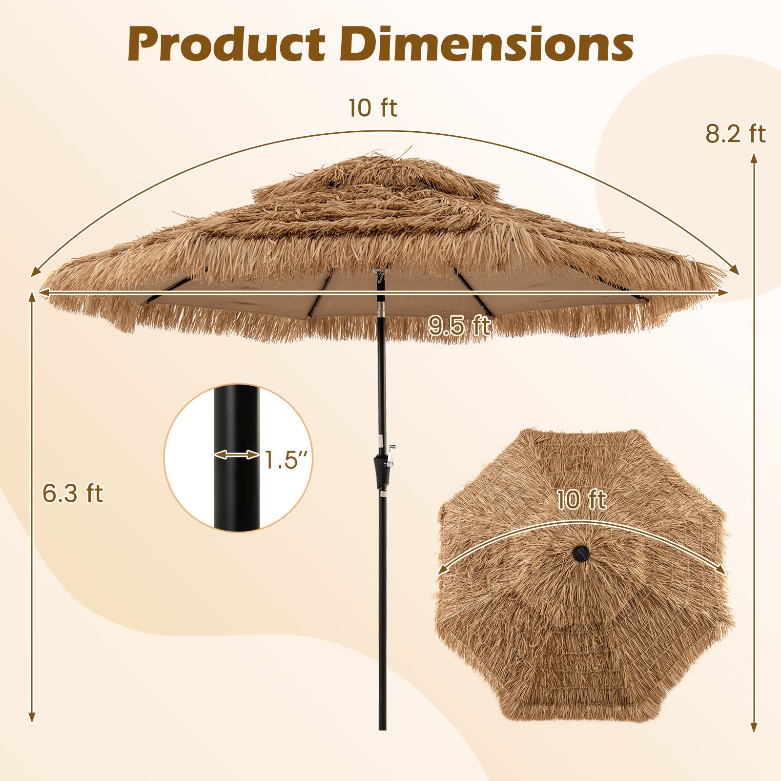 ● Sturdy and Simple Structure: Supported by 8 steel ribs the thatched umbrella is not easy to fall apart. And it is constructed of powder-coated steel pole which is rust-resistant and durable for long term use. Besides the 2 section umbrella pole is easy to assemble without additional tools. Note: The umbrella stand is not included. We recommend that the product be used with an umbrella stand.