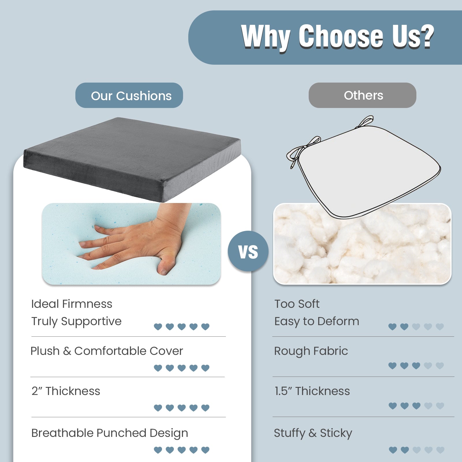 ● 35D Gel Infused Memory Foam: Structured with soft memory foam this seat cushion lets you feel comfortable cushy and supportive simultaneously. Plus with 35D high-elastic gel layer this dining room chair cushion offers you cool and breathable sitting pressure relief rather than the stuffy sticky or dry states and the simple thin layer design.