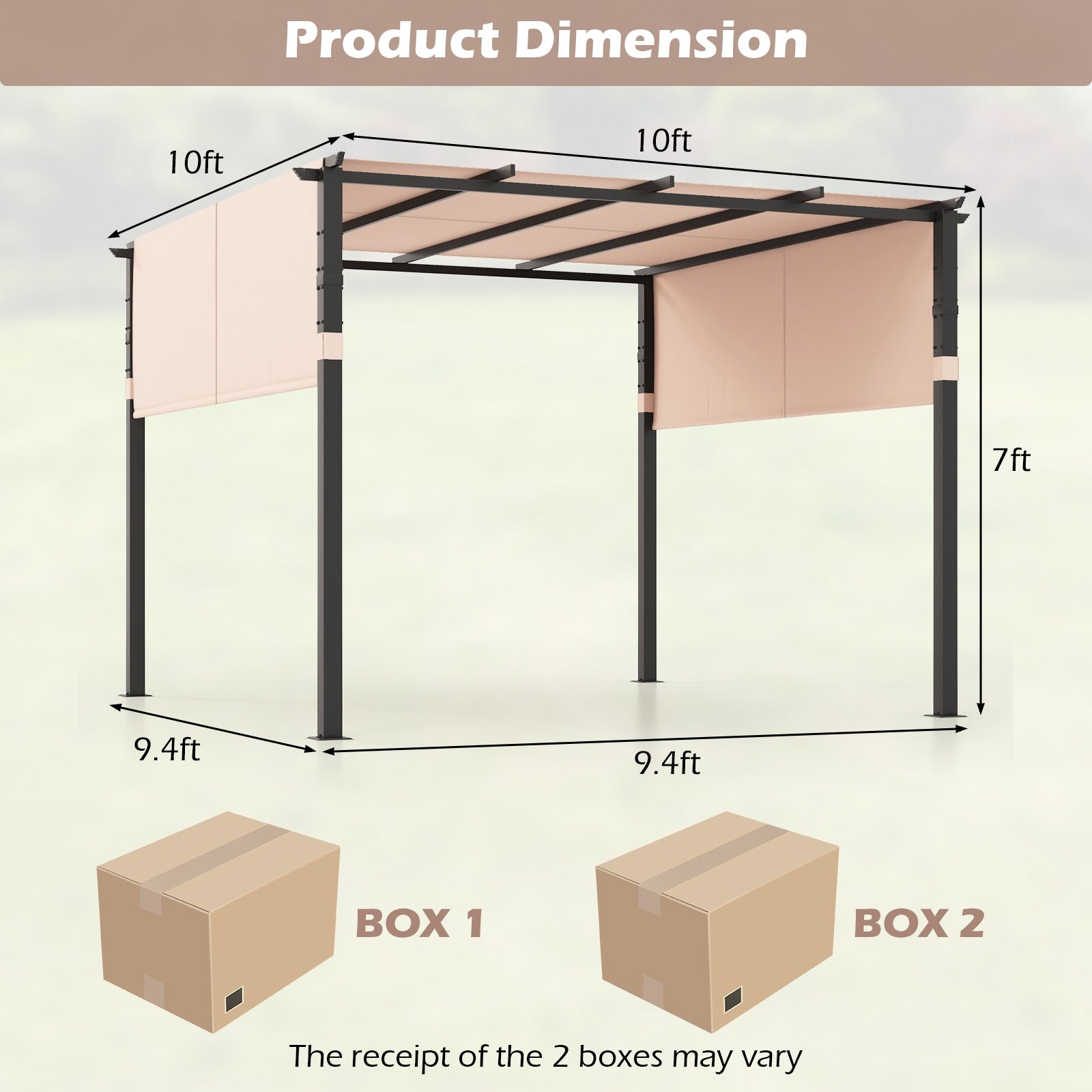 ● Large Space and Wide Usage: The 10 ft x 10 ft pergola offers ample space for a variety of outdoor activities such as BBQs birthday parties or other outdoor gatherings. With a simple beige color and classic flat top design the pavilion gazebo can seamlessly fit into gardens yards or decks.