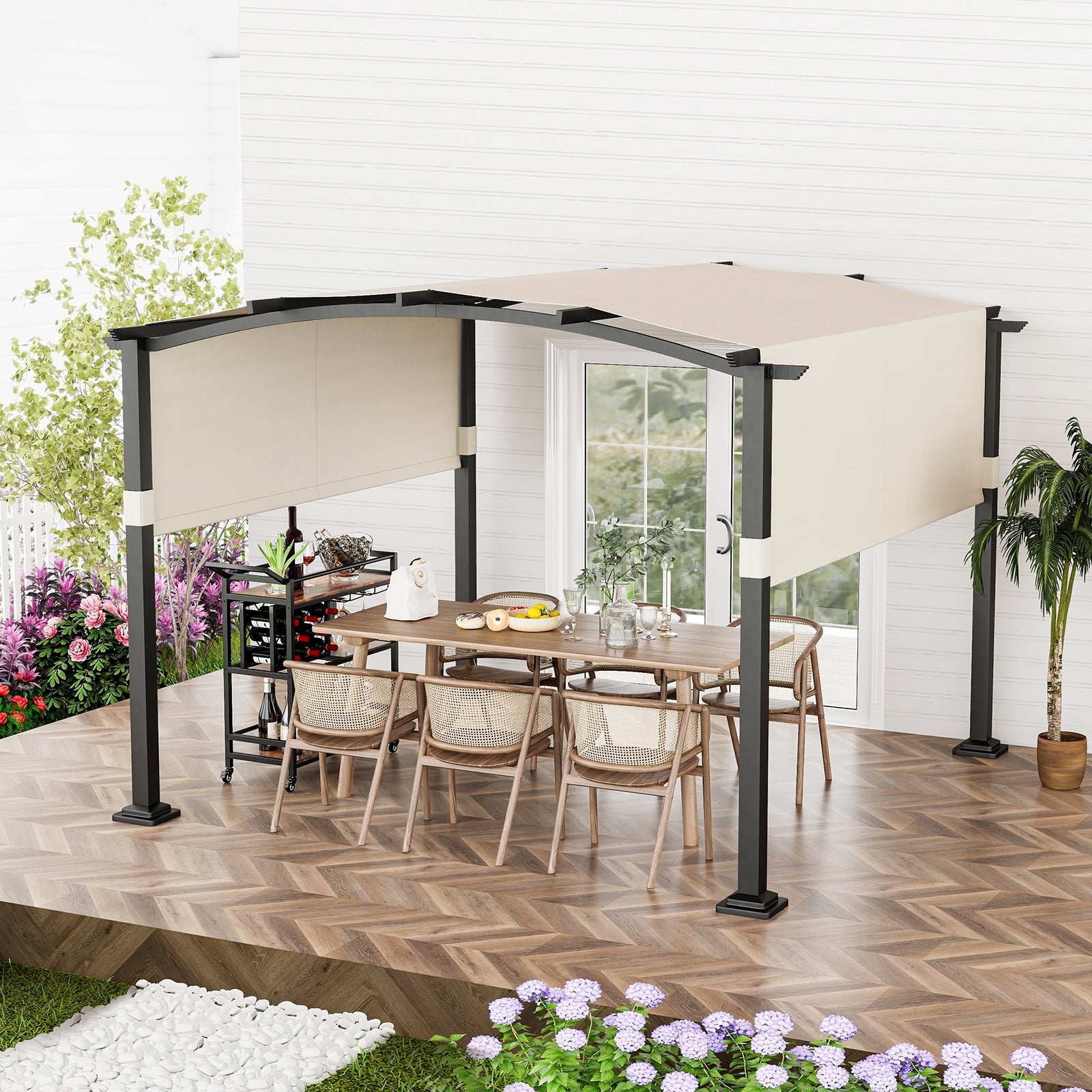 10 x 10 ft Outdoor Pergola Modern Arched Patio Garden Shelter with Retractable Sunshade Canopy-Beige