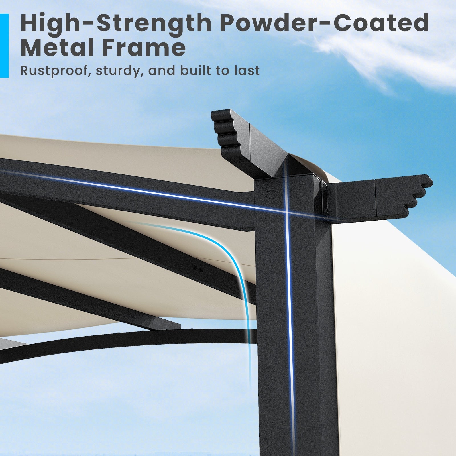 ● Arched Roof and Extended Eaves: In contrast to the flat top design this metal pergola adopts an arched roof which could reduce the pressure of standing water while adding a touch of sophistication. Additionally there are extended eaves for hanging lights or decorations.