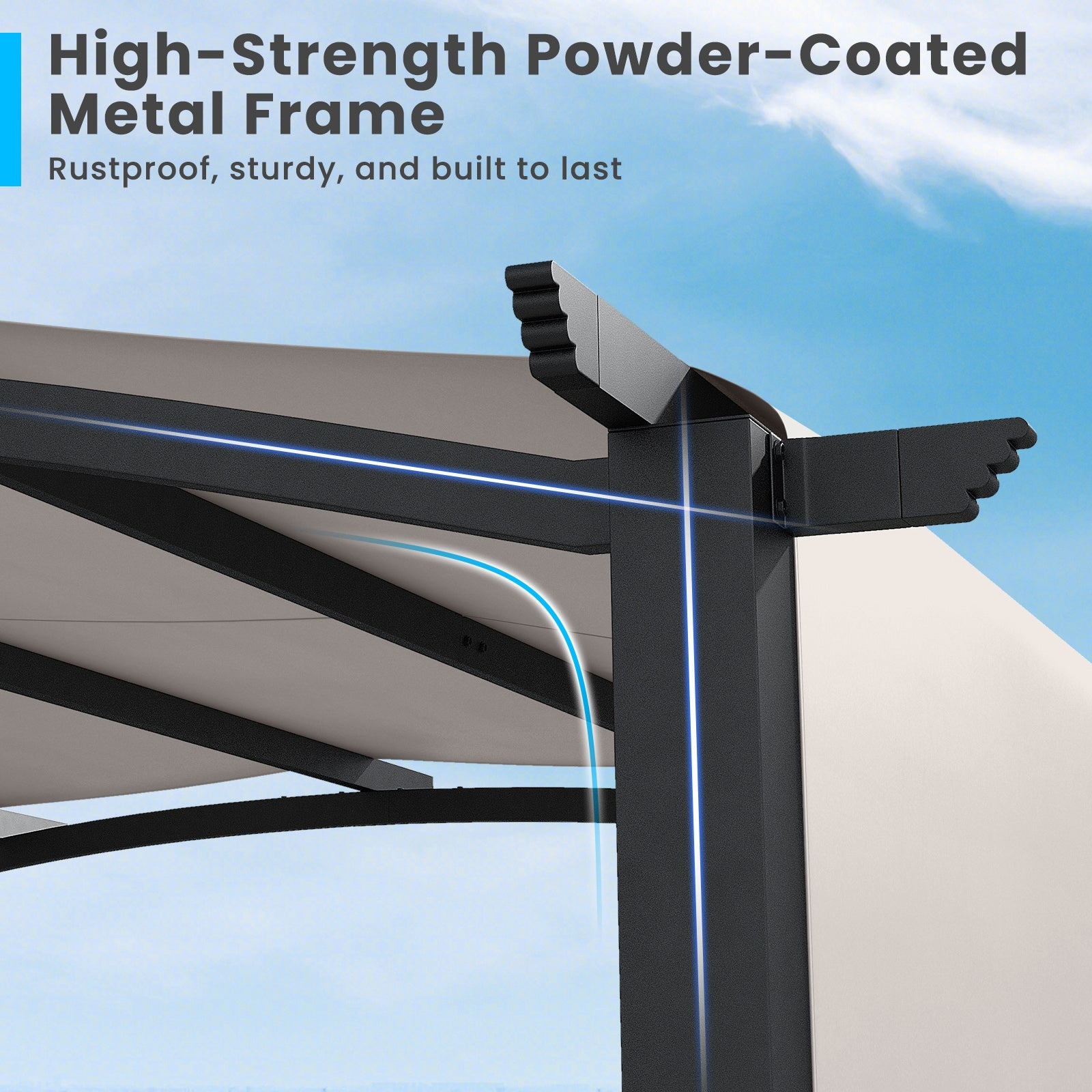 ● Arched Roof and Extended Eaves: In contrast to the flat top design this metal pergola adopts an arched roof which could reduce the pressure of standing water while adding a touch of sophistication. Additionally there are extended eaves for hanging lights or decorations.