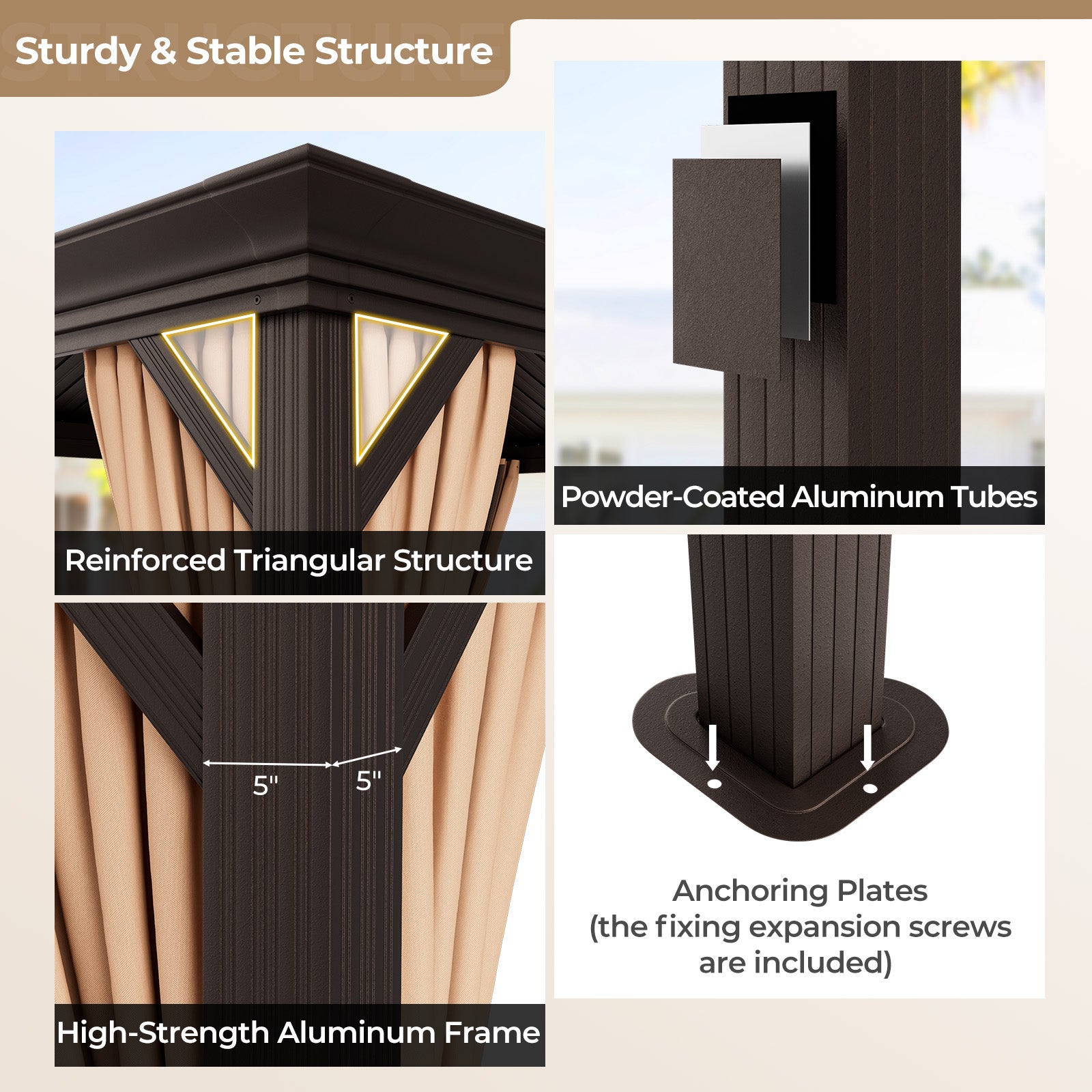 ● Sturdy and Stable Structure: The double-top gazebo is built with a high-strength aluminum frame and reinforced triangular structures providing strong support and ensuring good sturdiness. And there exist anchoring plates (the fixing expansion screws are included) on the bottom that can be firmly fixed into the ground adding extra stability.