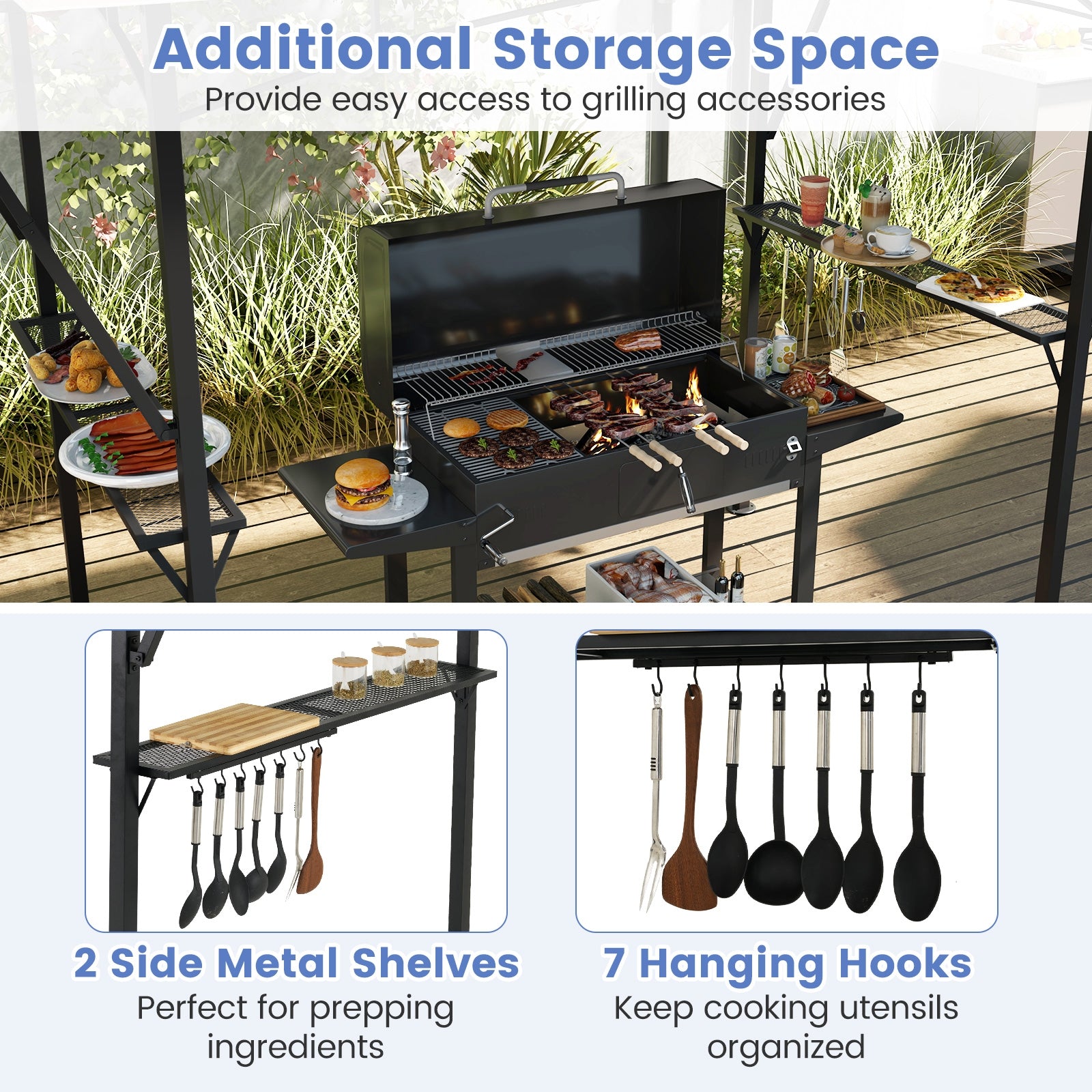 ● Thoughtful Features: The gazebo is equipped with 2 side shelves for convenient storage of grilling essentials along with 7 hooks for hanging utensils and accessories. Additionally it comes with a ceiling hook perfect for suspending a light fan or decoration (not included).