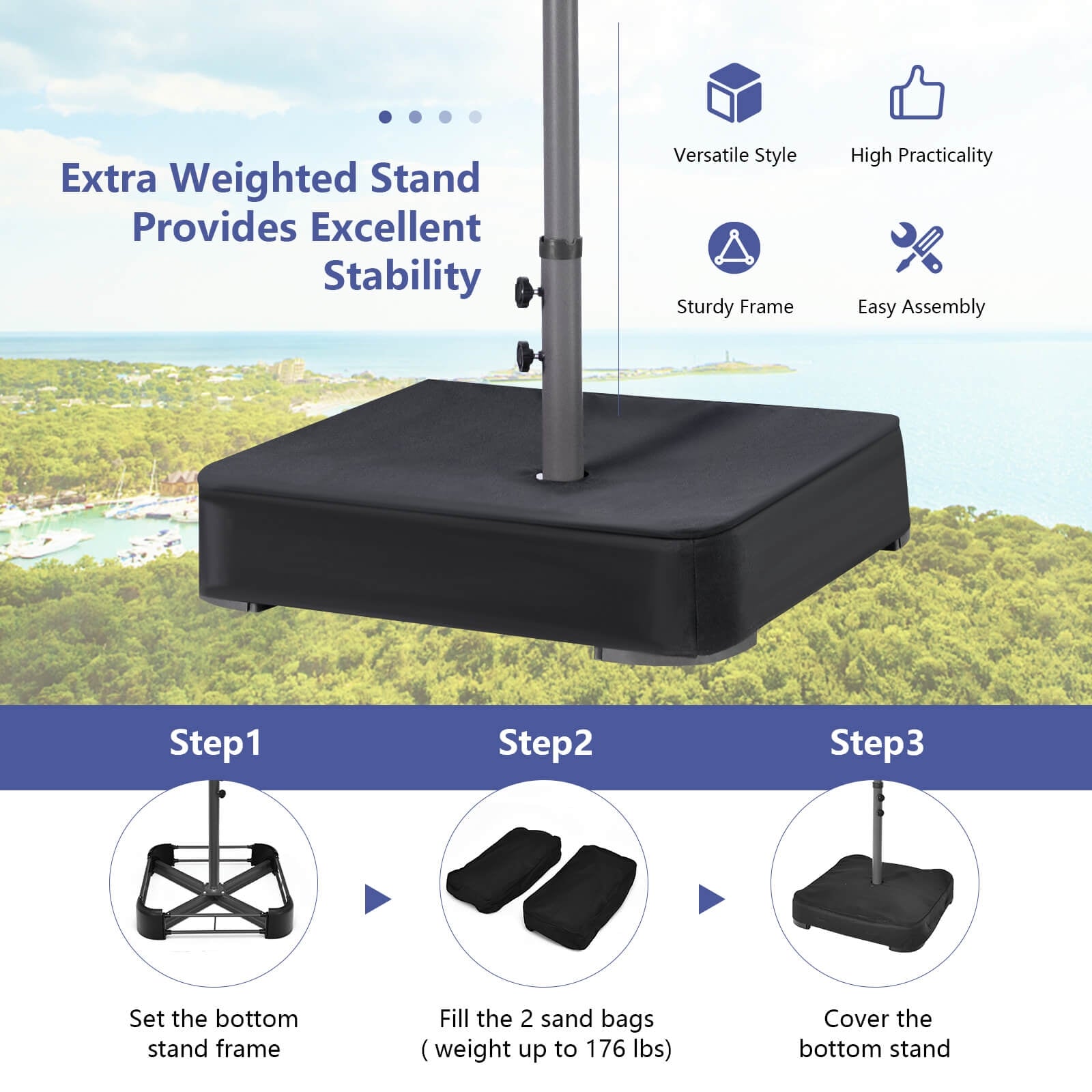● Easy-to-Assemble Widened Base: The extra-base comes with 2 large sandbags (sands are not included and each sandbag can be filled with 88 lbs sand to keep the umbrella stable) preventing wobbling during use. Besides it is ultra-quick to assemble the base and umbrella by following the detailed instructions.