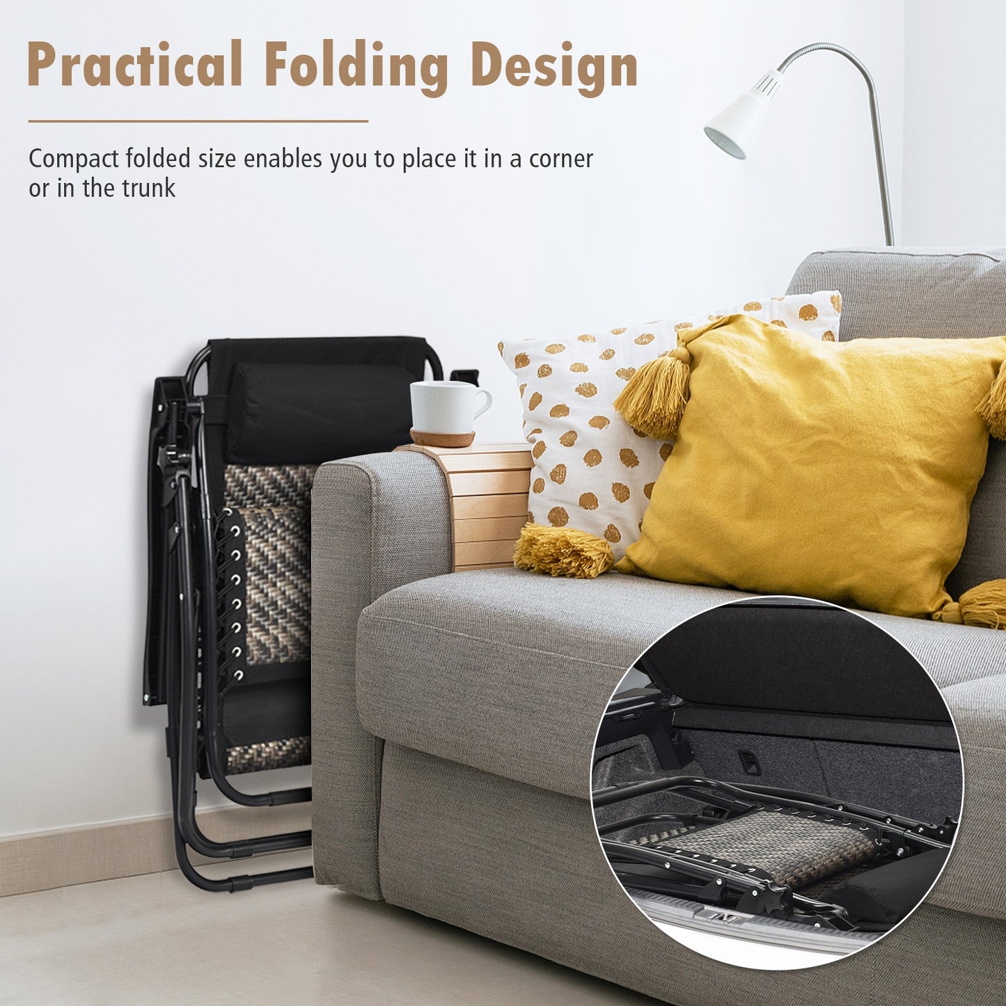 - Foldable Design for Convenient: This rattan zero gravity chair can be folded into a compact size when not in use which occupies little space in your home. Because of the lightweight design it is convenient for you to put this lounge chair in the trunk when you go out to enjoy leisure time with your family members.