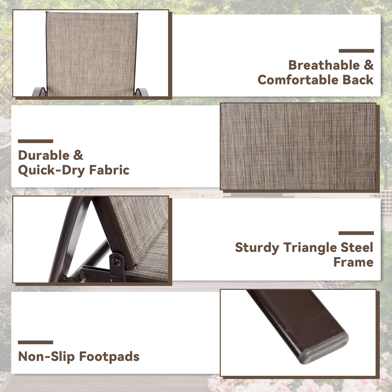 ● Sturdy and Stable Construction: Crafted with a powder coated steel frame this patio chair is sturdy and solid which has a long lifespan. The premium fabric of seat is durable enough to stand the test of time. What's more the legs with non-slip foot pads form a triangle with ground increasing the stability.
