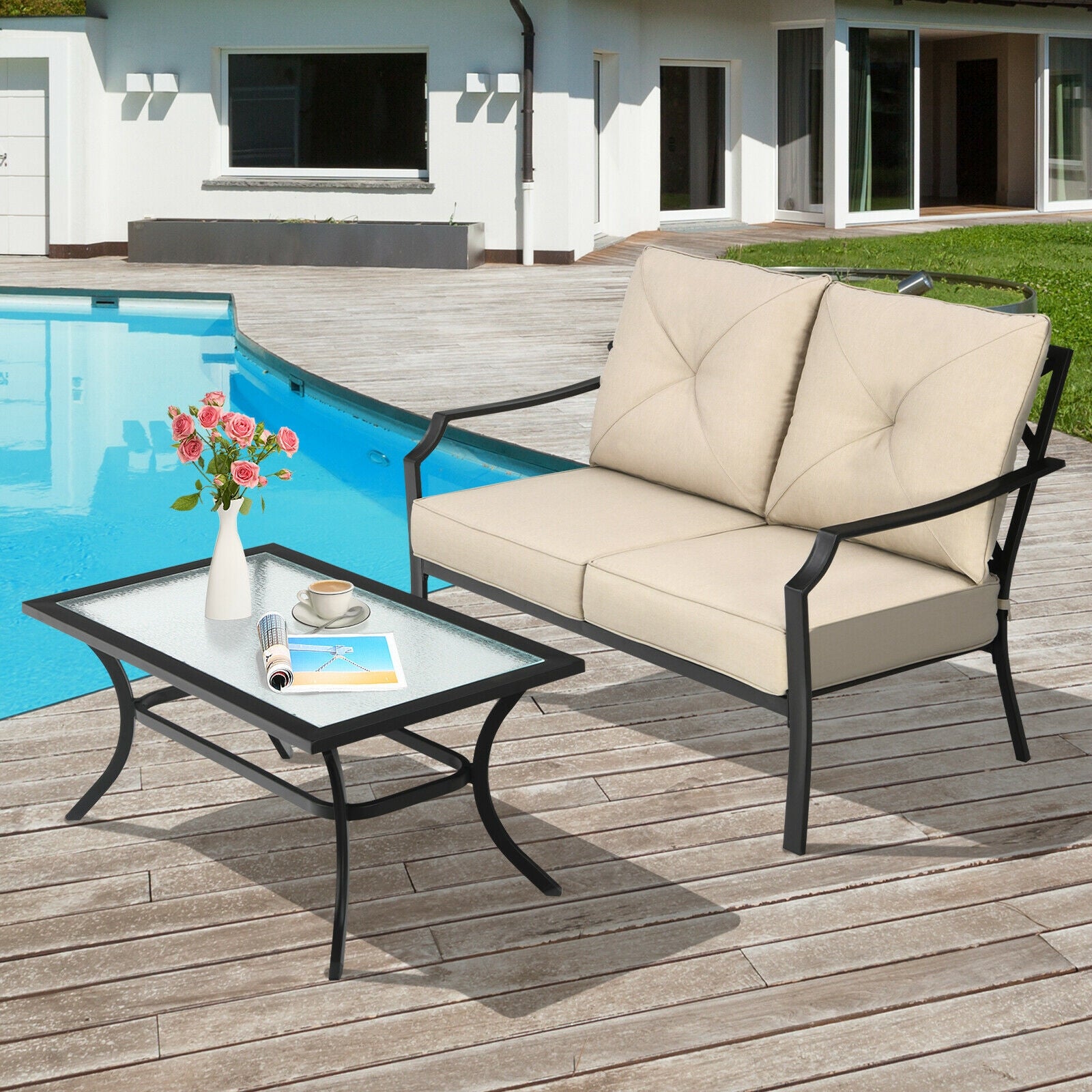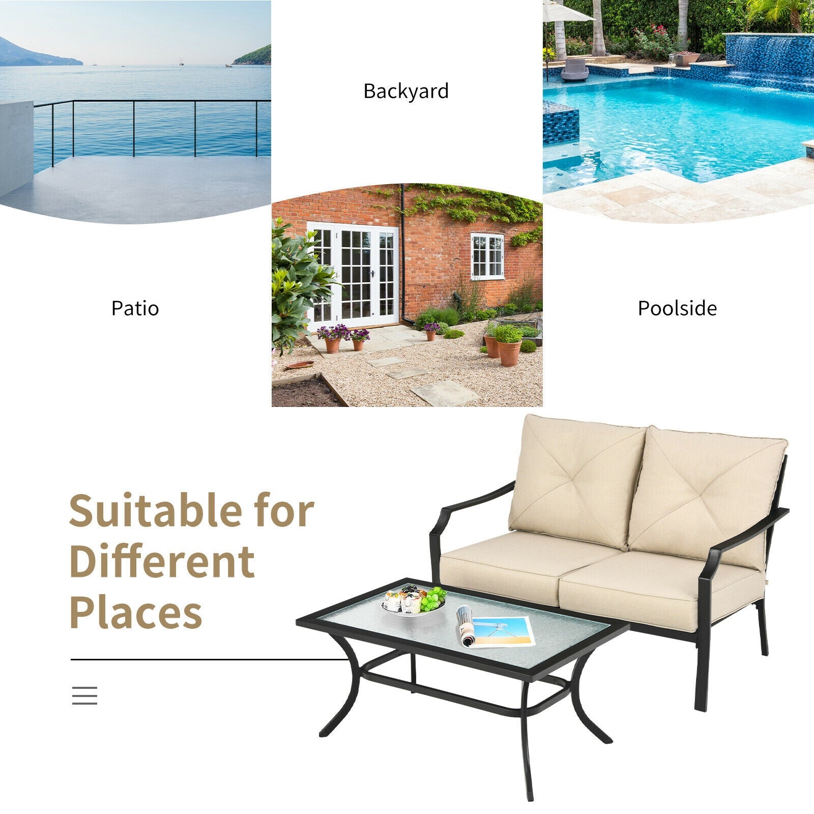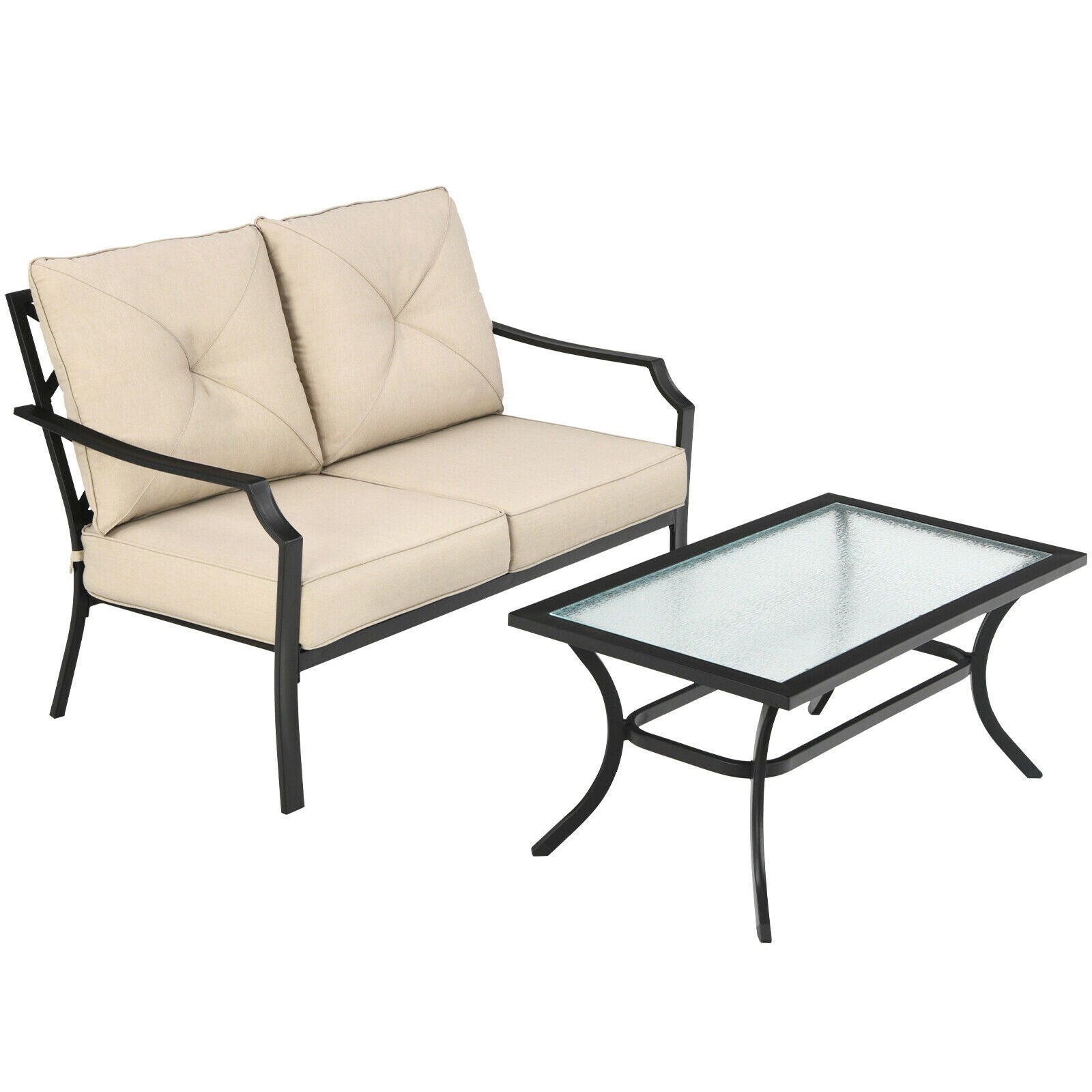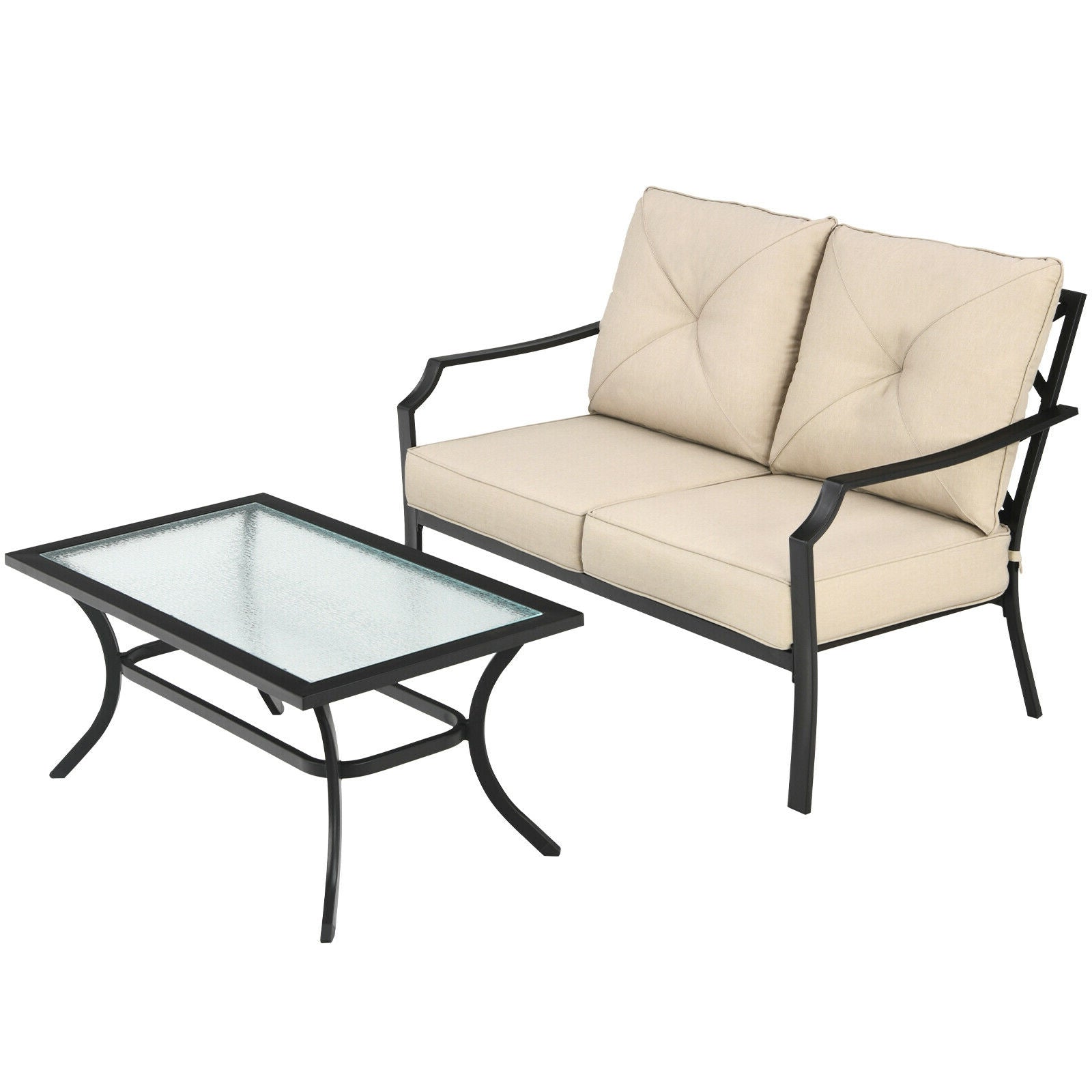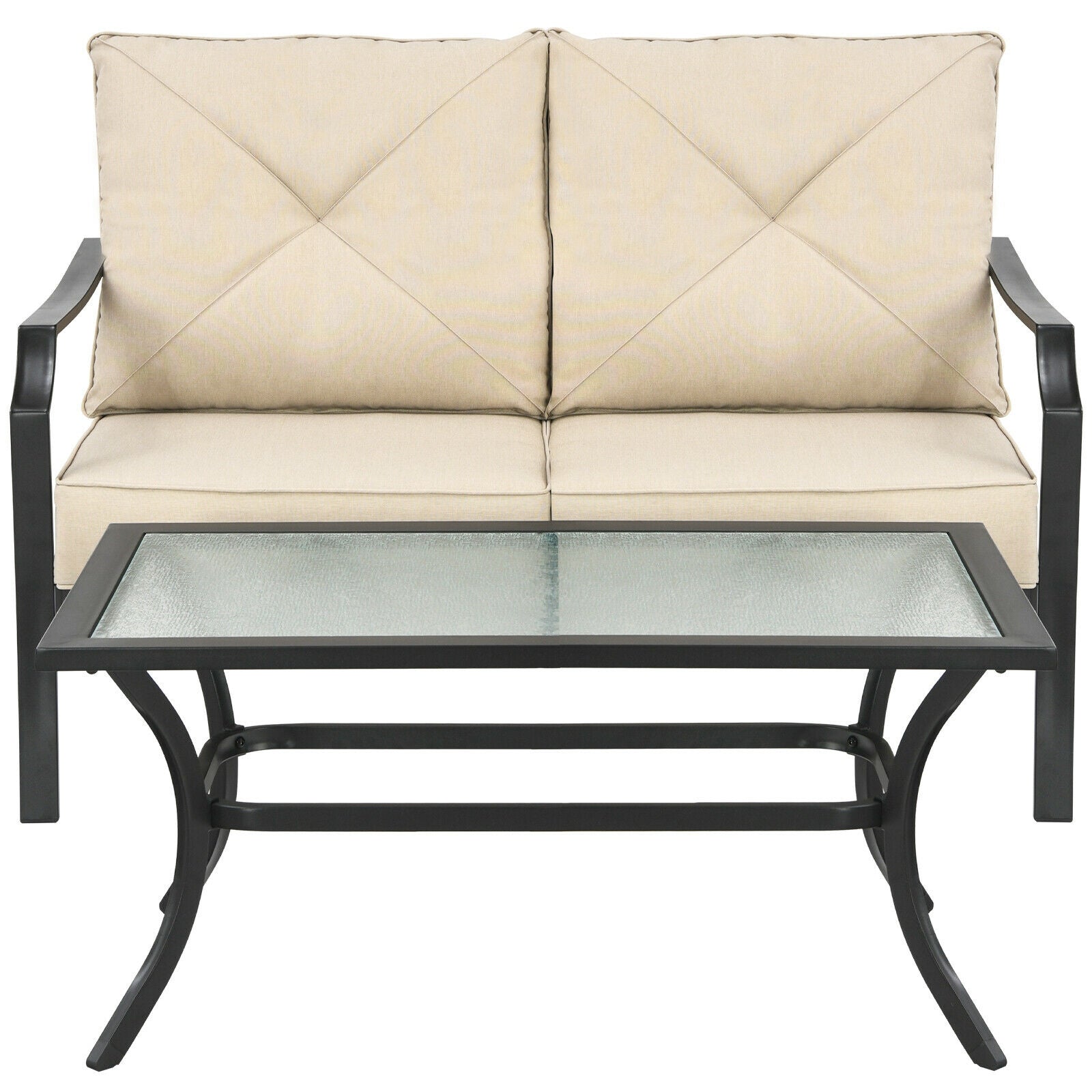 Including loveseat and coffee table this outdoor patio furniture will be the perfect place to enjoy your leisure time. The thick and soft cushions are comfortable for sitting. Meanwhile the ergonomic backrest and armrest can support your body cozily. And you can put your items on this large coffee table. What's more the rustproof steel frame breathable olefin fabric quick-drying fabric and high quality glass make our outdoor sofa bench and coffee table durable and stable.