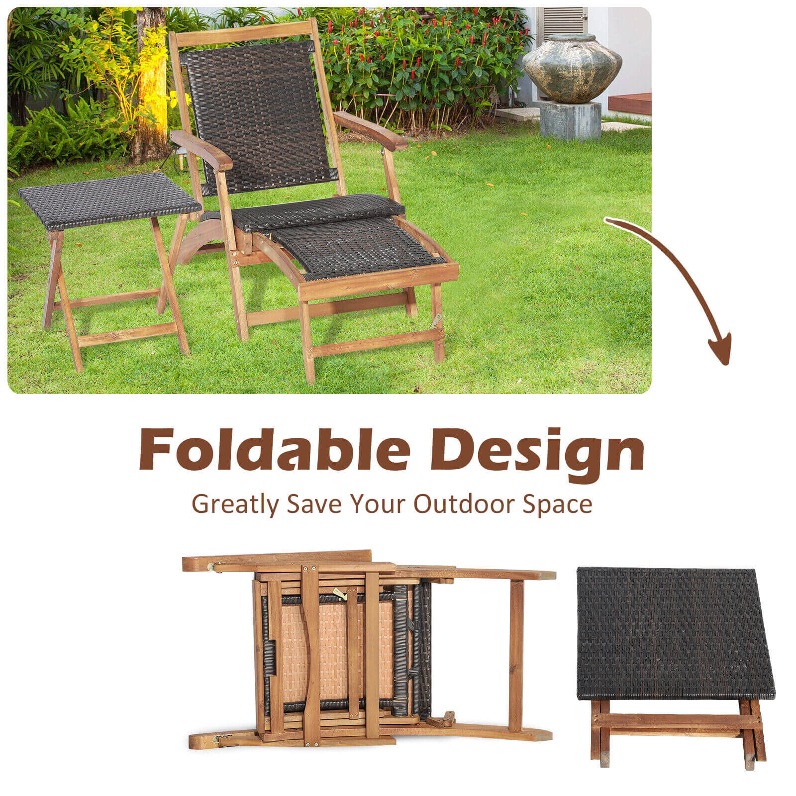2 Pieces Patio Rattan Folding Lounge Chair with Acacia Wood Table