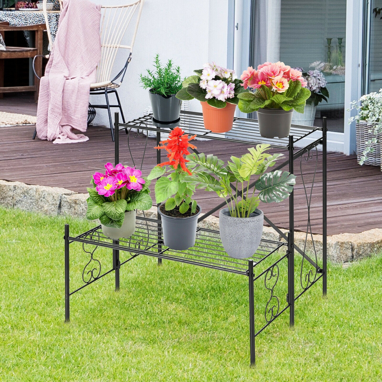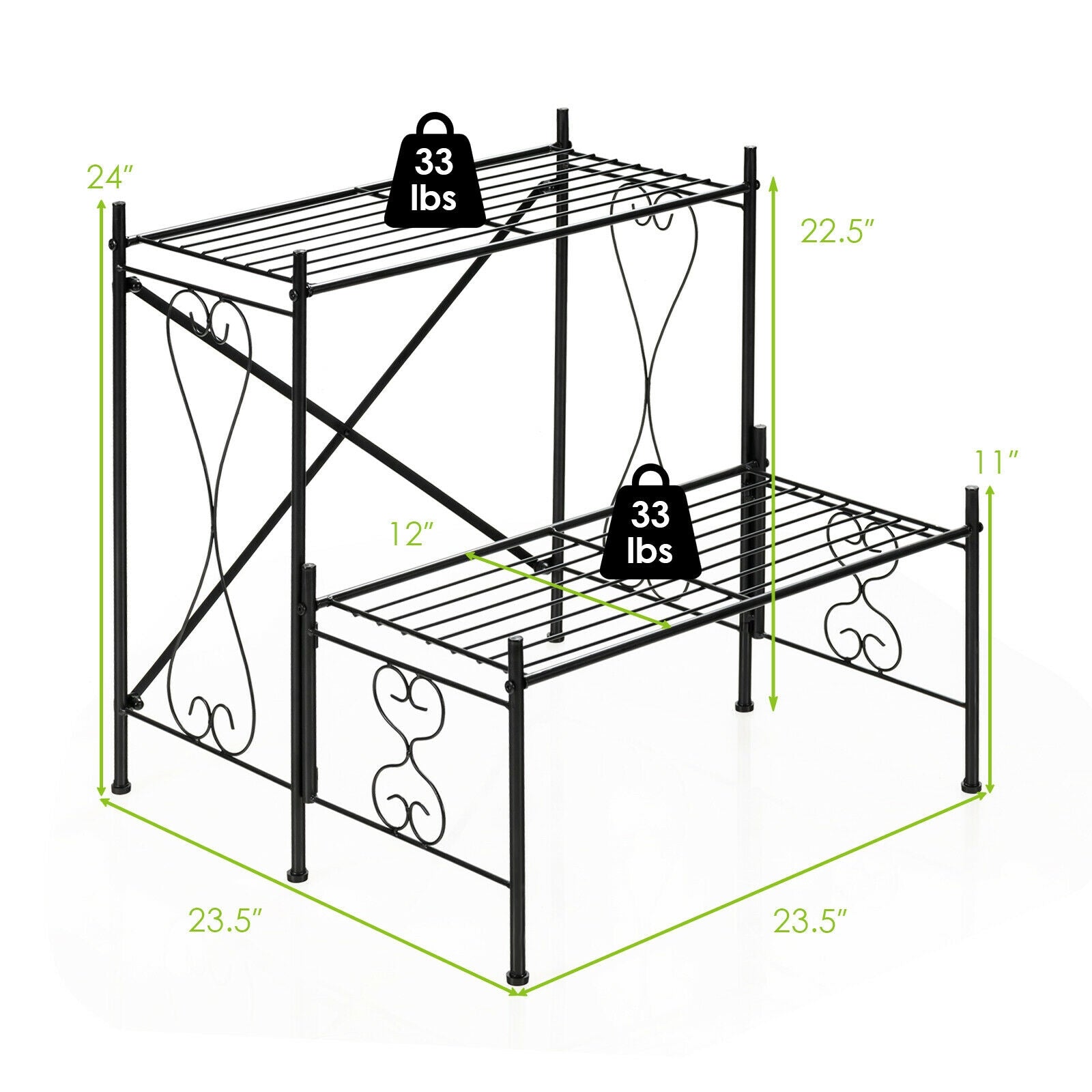 Designed with 2-tier shelf this plant rack offers ample space for all your stuff such as plants flowers pots shovels and more. Your plants will enjoy enough sunlight due to the vertical design and perfect height. Thanks to its suitable gaps you don't have to worry about plants falling accidentally. And the sturdy metal construction with durable black powder coated finish promises long-lasting use. What' more you can move and install this lightweight plant stand without much effort. This attractive and space-saving flower pot holder is a perfect tool to decorate your backyard garden living room patio and more. Create a perfect home layout and organize your plants with this sophisticated 2-layer flower stand!
