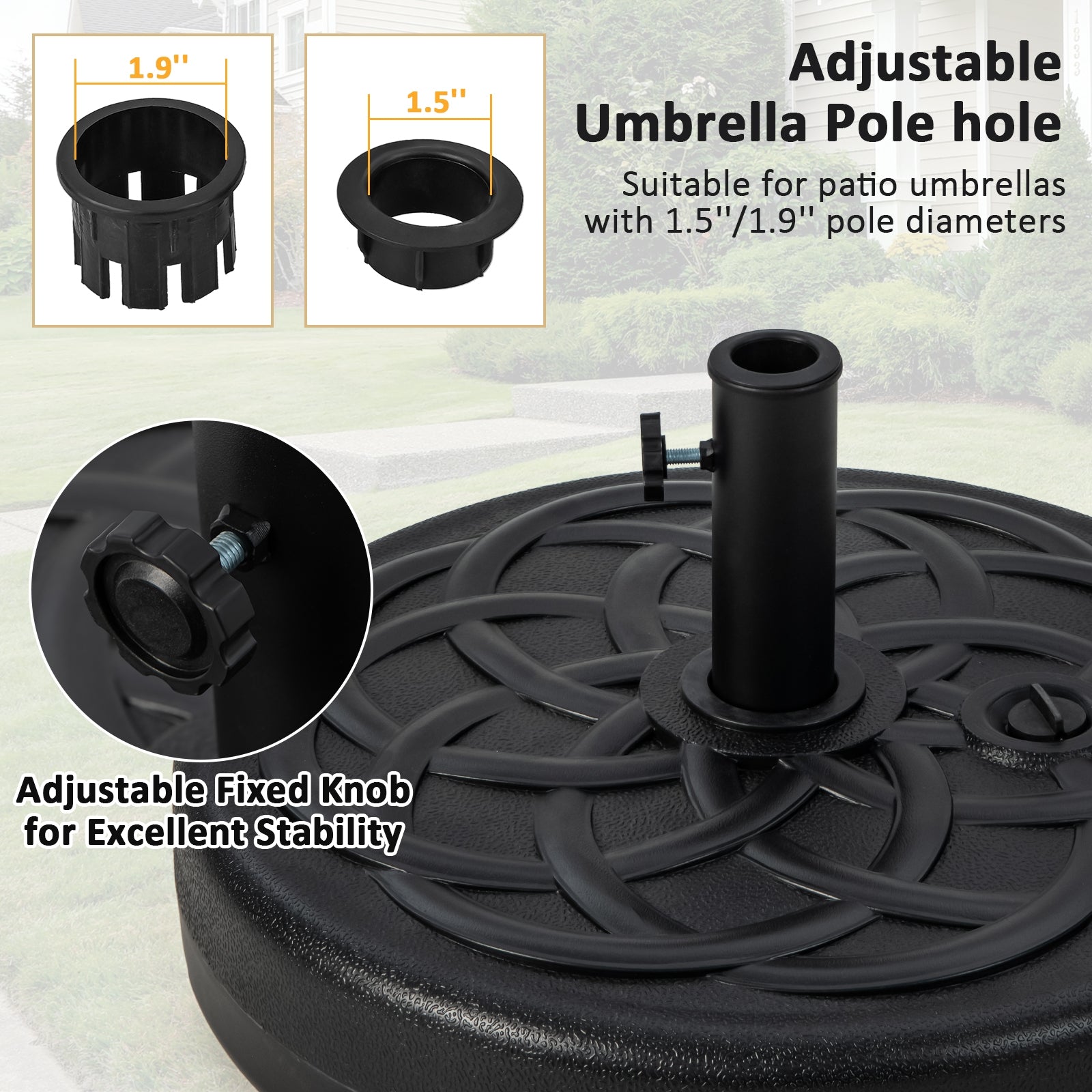 ● Adjustable Umbrella Pole Hole: The fillable umbrella base is equipped with a metal supporting pole and 2 plastic inserts which can accommodate most market umbrellas and patio table umbrellas. It is suitable for most patio umbrellas over 10 ft with 1.5"/1.9" pole diameters.