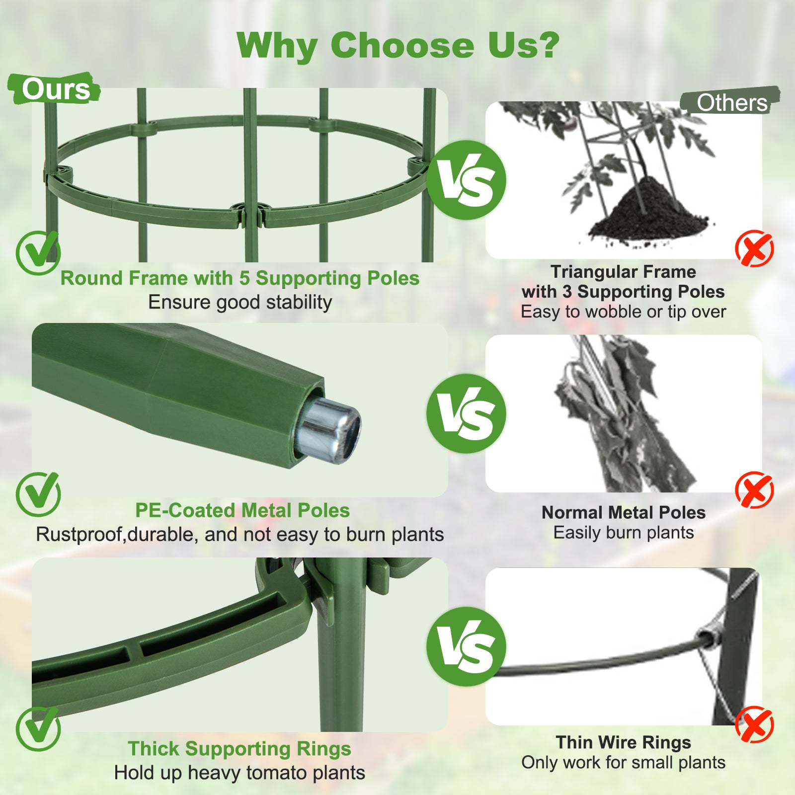 ● Durable and Safe Materials: The garden trellis is constructed of PE-coated metal poles which are rustproof durable and not easy to burn plants. Moreover with a round frame and 5 supporting poles along with thick supporting rings it provides reliable and long-lasting structural stability.