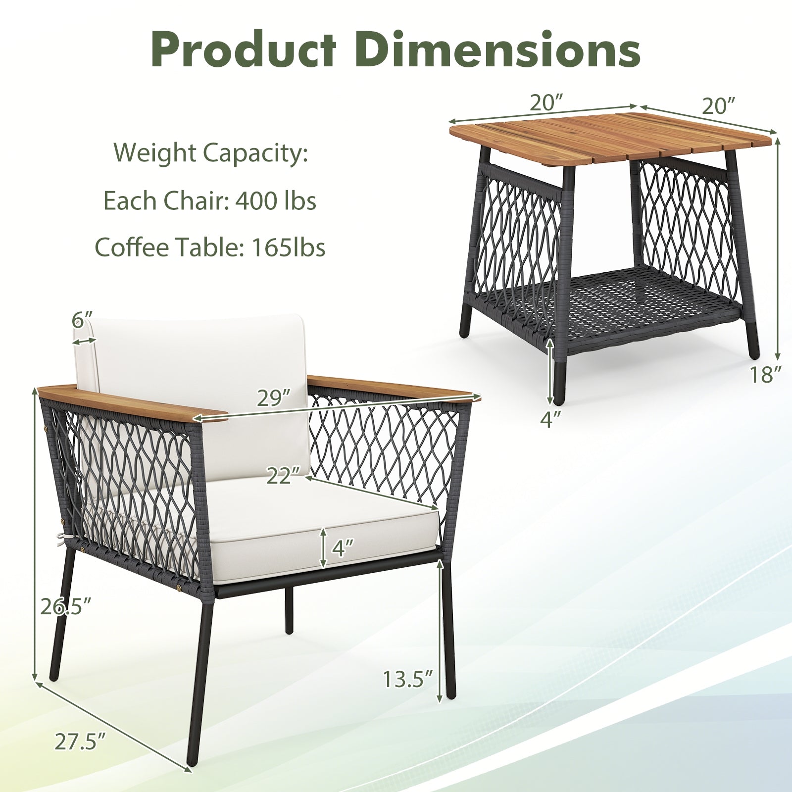 3 Piece Patio Furniture Set Rattan Chair Set with 2-Tier Coffee Table-White