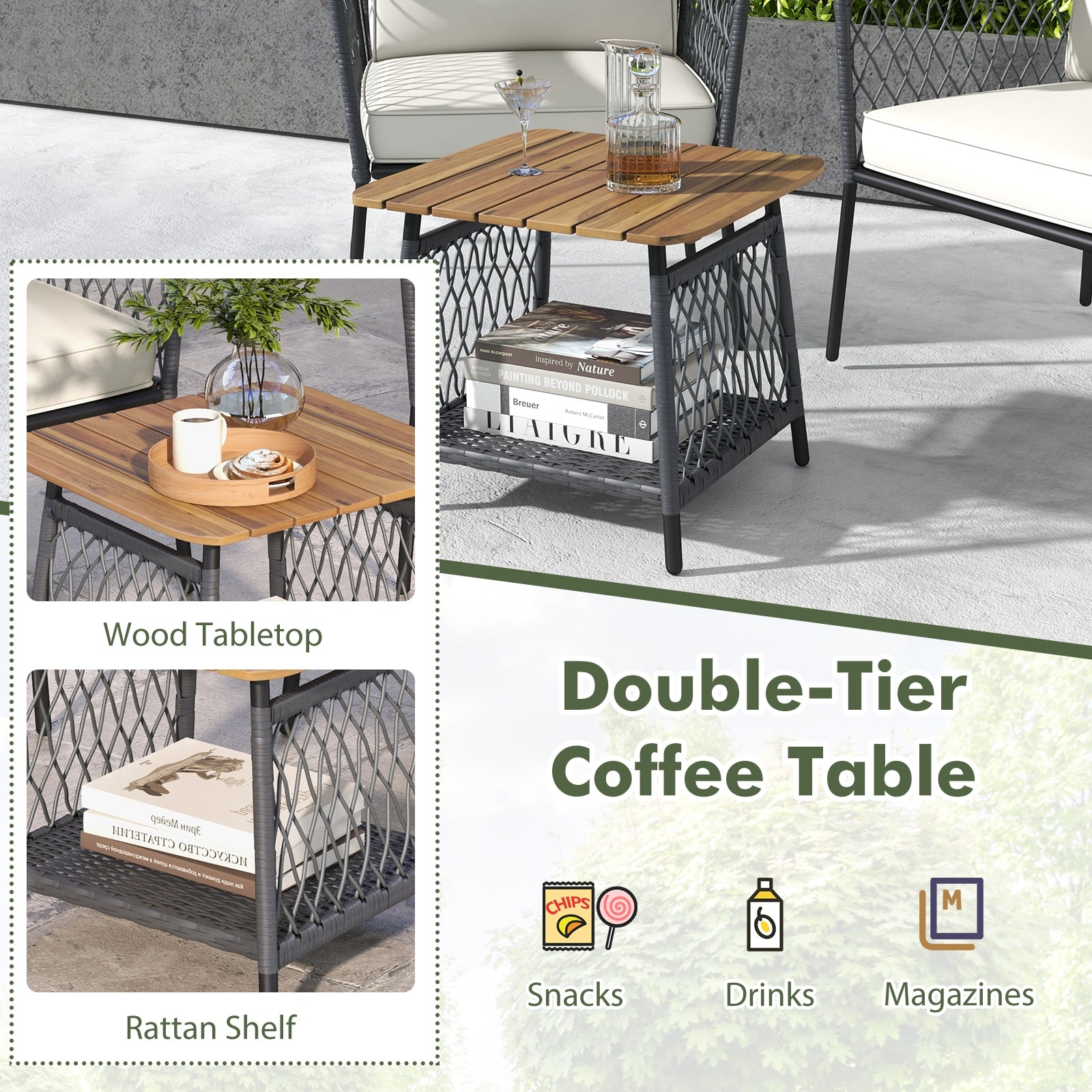 ● Double-Tier Coffee Table: This 3-piece patio set also comes with a 2-tier coffee table featuring wood tabletop and rattan shelf providing ample space for drinks snacks and magazines.