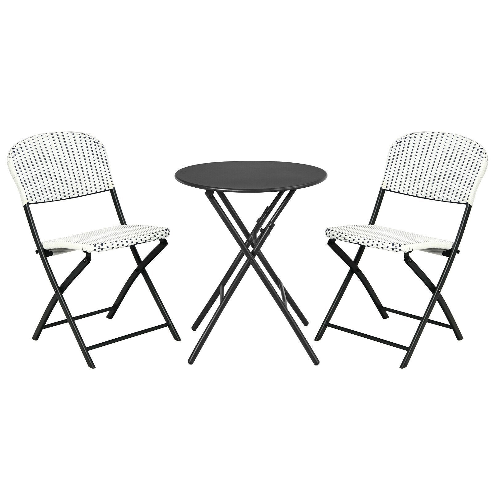 The heavy-duty steel frame provides a solid foundation for this delightful dining set. Besides durable PE rattan ensures long-lasting use and is suitable for outdoor use. Plus X-shaped construction and 4 anti-slip foot pads provide adequate stability. With folding design this outdoor bistro set is convenient to store and transport. Furthermore free installation design saves your time and effort.