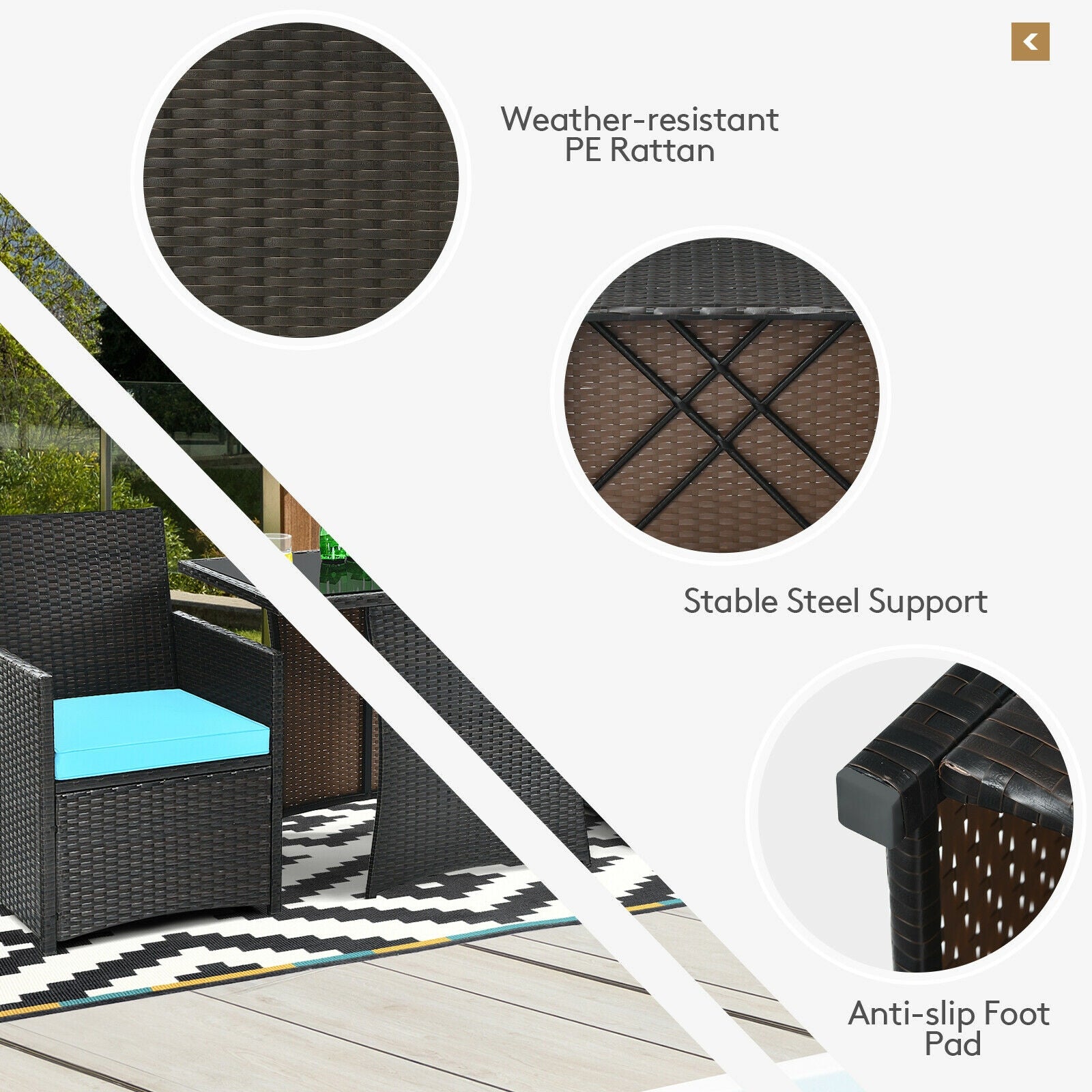 3 Pieces Patio Rattan Furniture Set with Cushion and Sofa Armrest-Turquoise