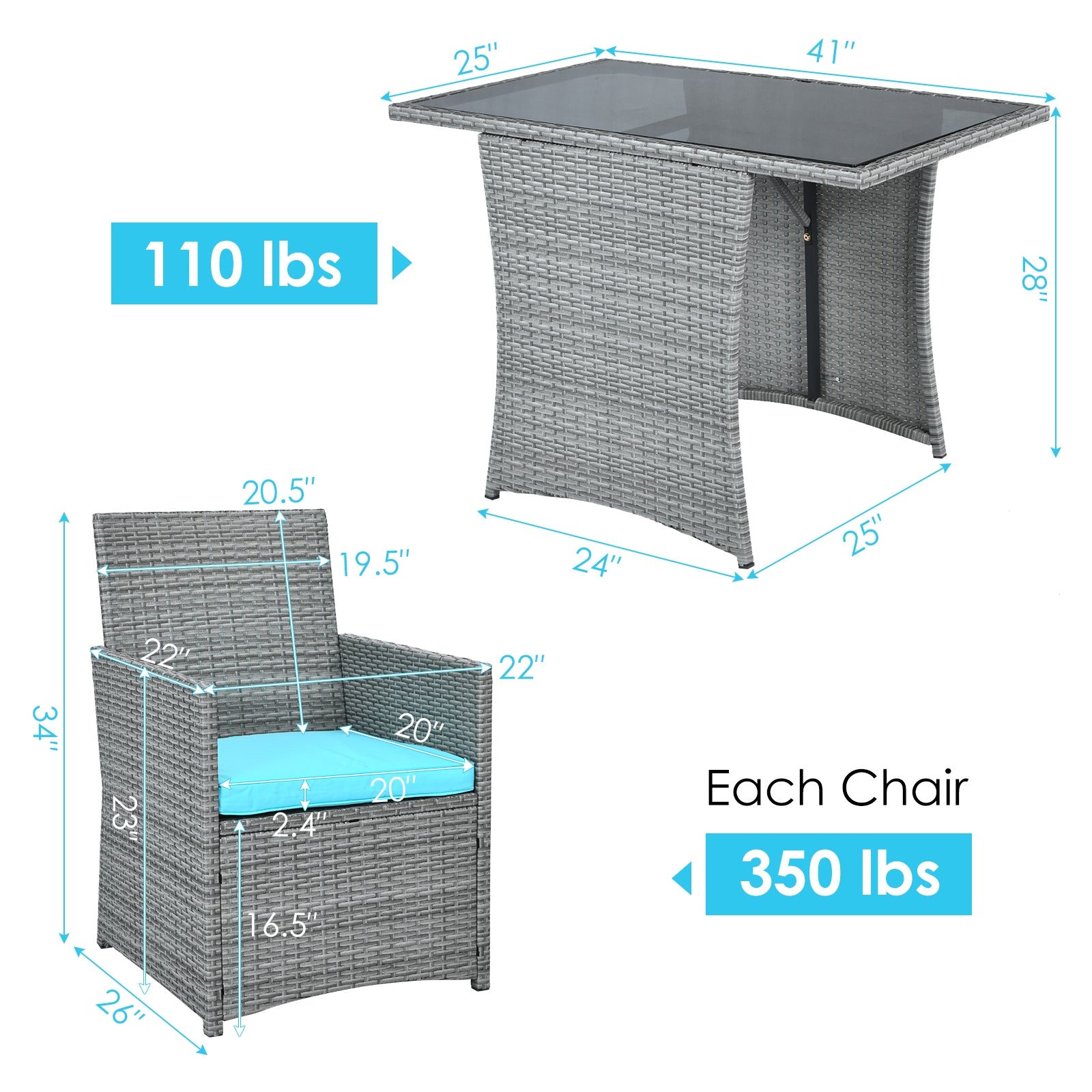 With curved backrests comfy armrests and soft cushions this outdoor bistro set provides optimal comfort for outdoor relaxation. Considering the changeable weather this patio dining set is constructed of anti-rust steel frame and all-weather PE rattan. If you accidentally spill a drink on the table or cushions don't worry. The smooth tabletop with durable tempered glass is easy to clean. And the cushion covers with zipper design can be detachable for easy maintenance. After using it you are able to store 2 chairs under the table to save your outdoor space.