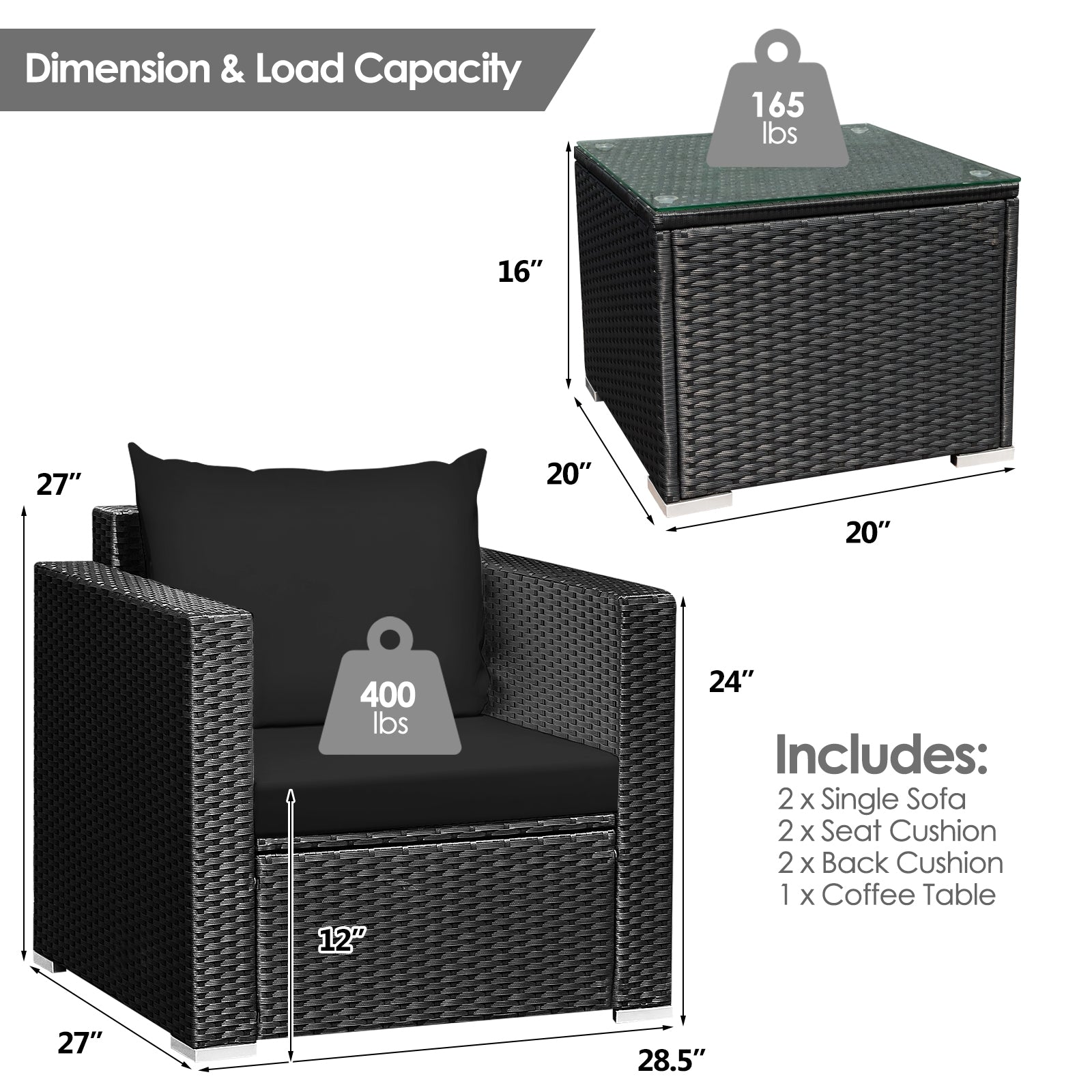 3 Pieces Patio Wicker Conversation Set with Cushion-Black