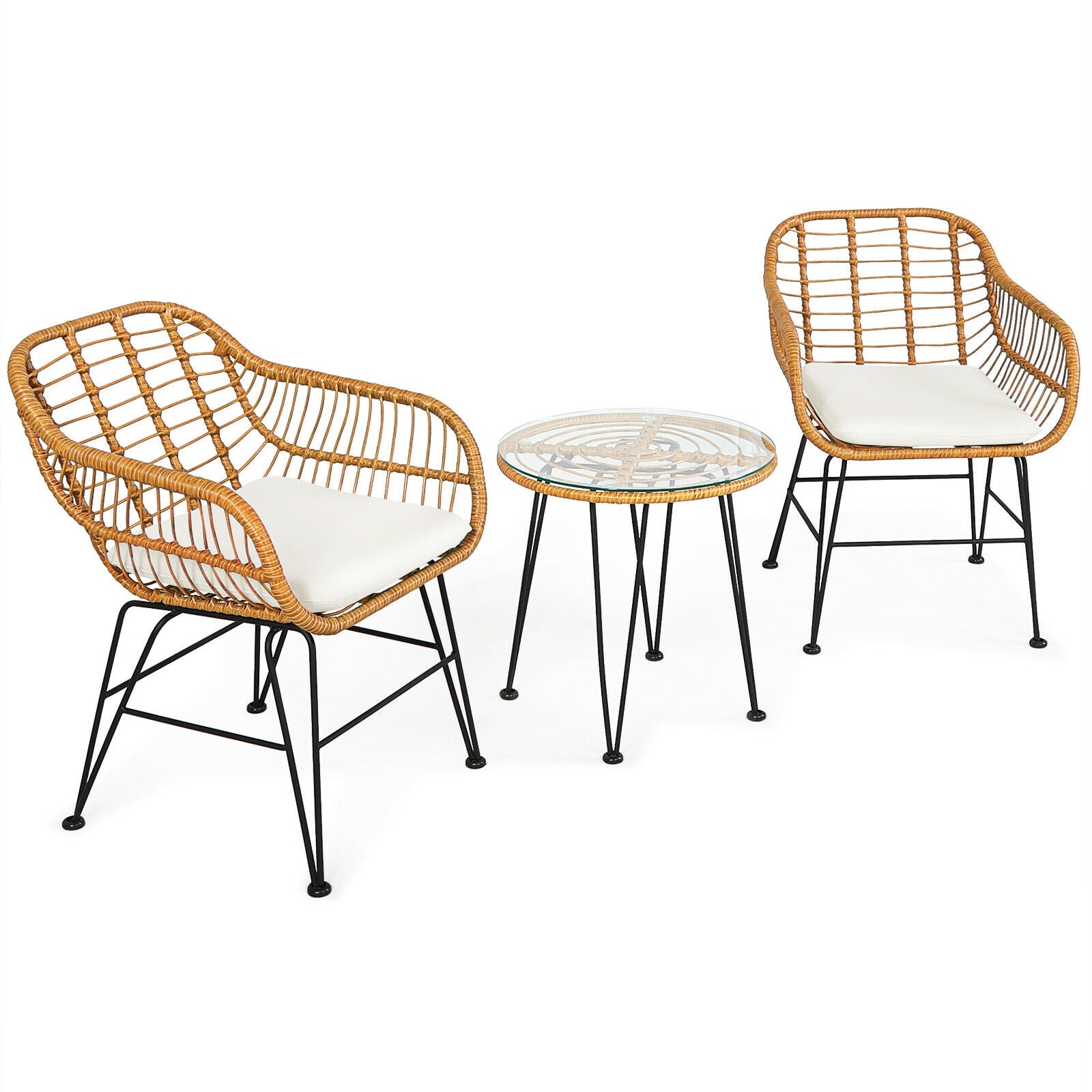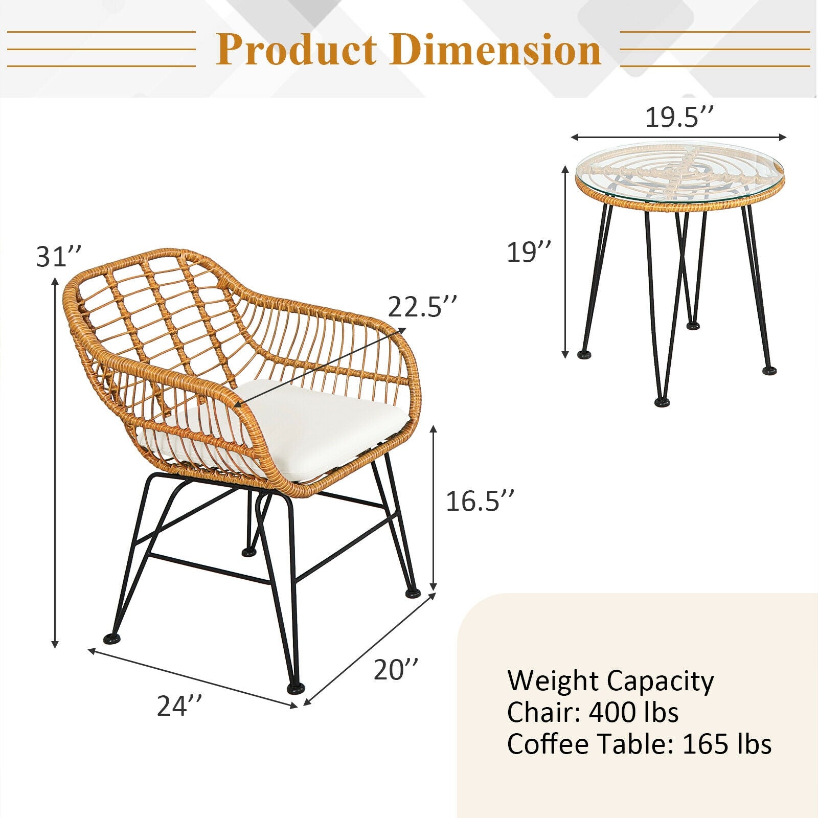 Supported by a sturdy steel frame with anti-slip foot pads this patio furniture set is super stable. And the weather-resistant rattan makes each piece of this bistro set durable enough to support a long service life. The strong tempered glass tabletop perfectly holds meals drinks and fashion magazines. In addition thick sponge padded seat cushions provide luxurious comfort for you and the cover of cushion can be removed with the smooth zipper for easy cleaning. Thanks to the modern and simple design this rattan furniture set can be placed anywhere you like.
