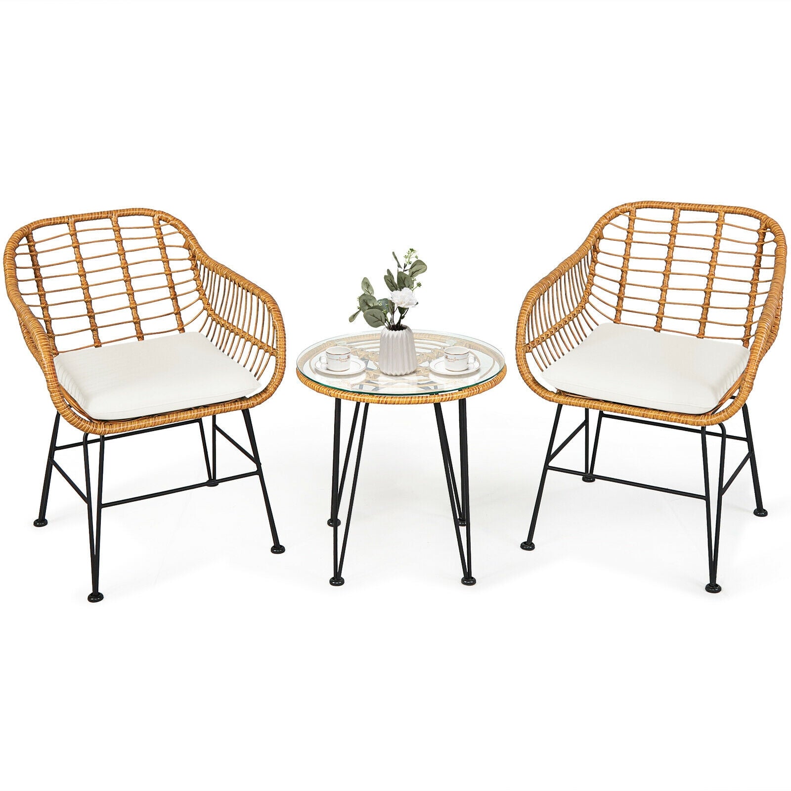 3 Pieces Rattan Furniture Set with Cushioned Chair Table-White