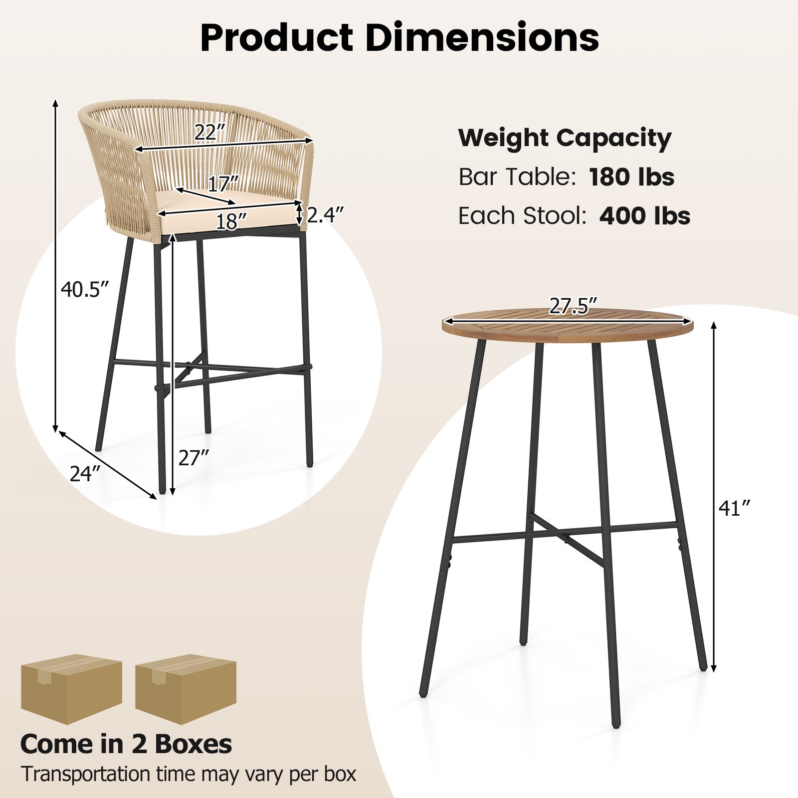 3 Pieces Rope Woven Patio Bar Set with Soft Cushions and Acacia Wood Tabletop-Beige
