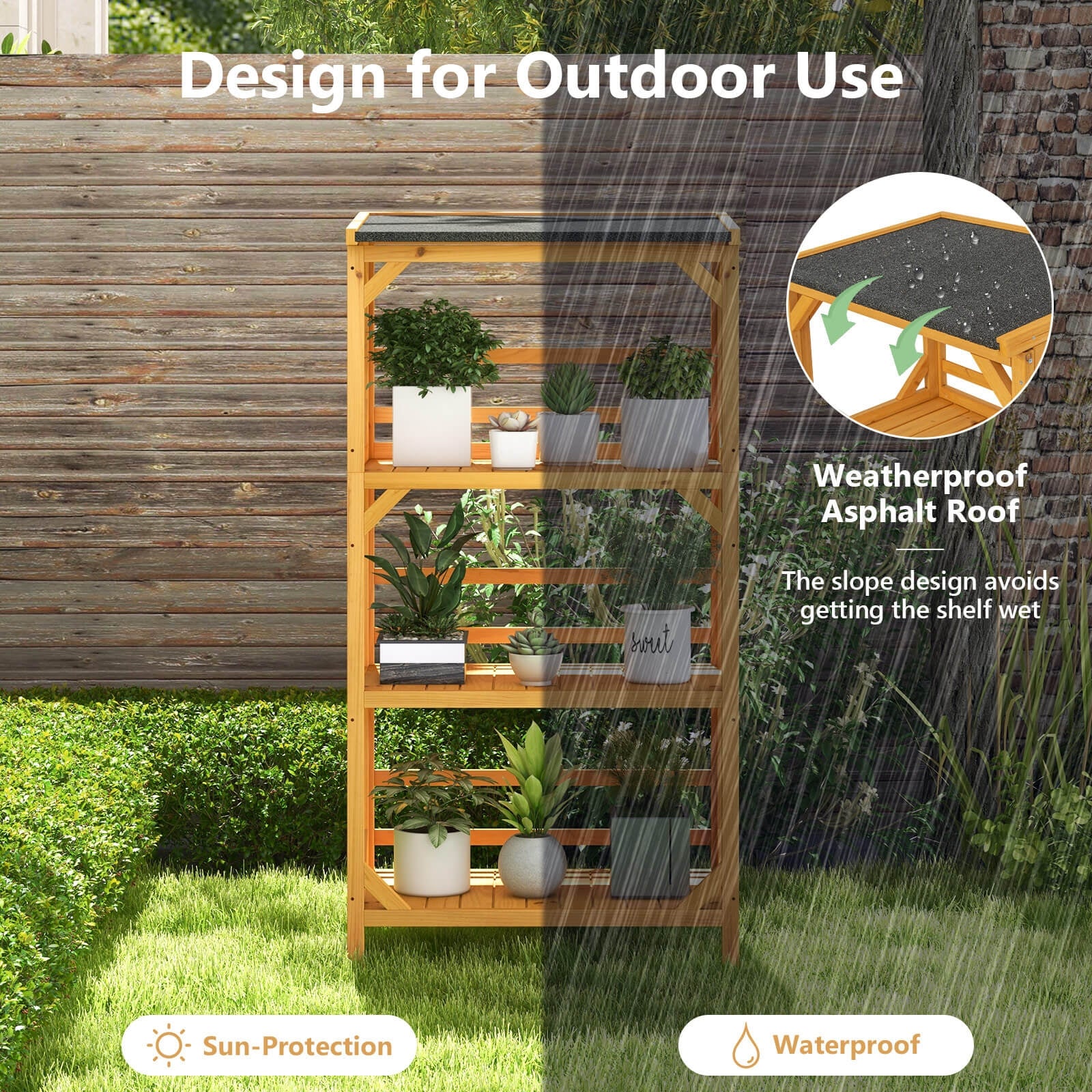 3-Tier Wooden Plant Stand with Weatherproof Asphalt Roof for Patio-Natural