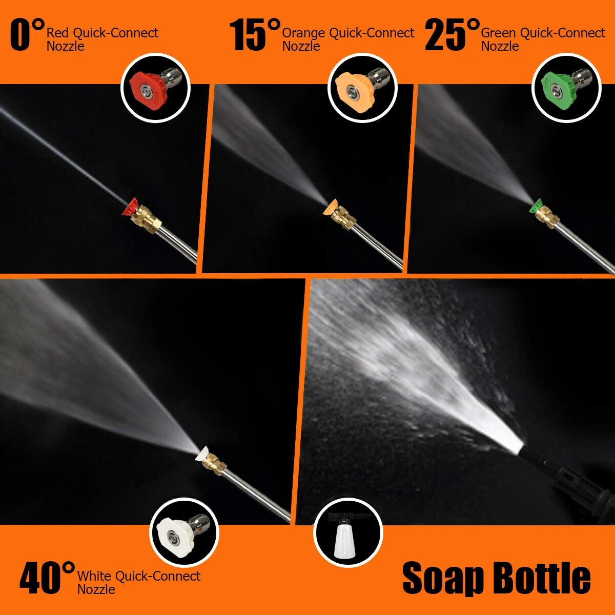 ● 4 Interchangeable Nozzles and Soap Bottle: The high-pressure washer comes with 4 quick-connect nozzles of various sizes (0” 15” 25” 40”). It's useful for multiple scenarios making cleaning process more efficient. Additionally detergent or disinfectant can be stored in the soap bottle for deep cleaning.