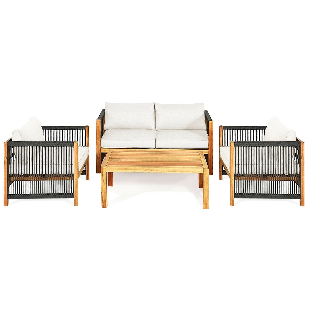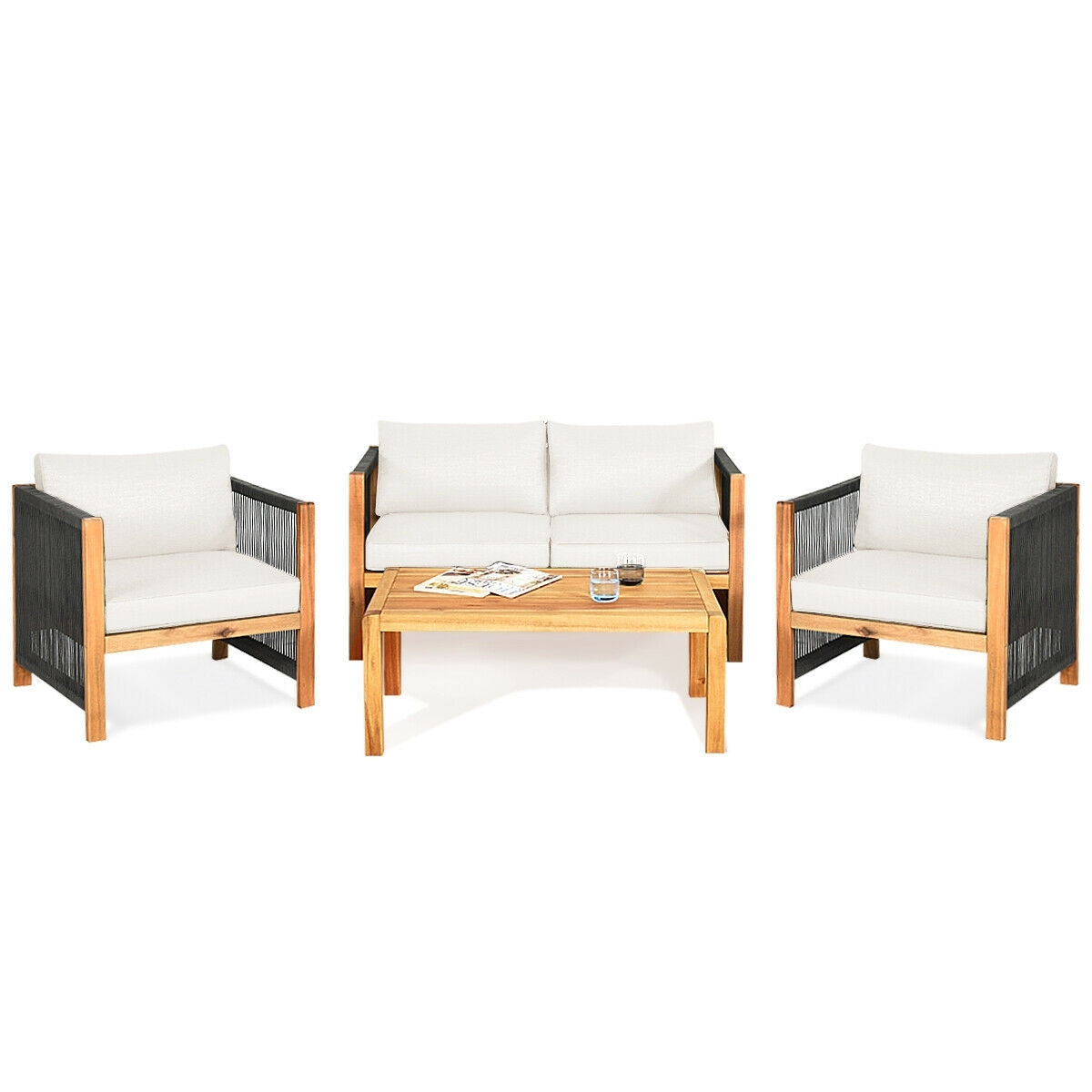 4 Pcs Acacia Wood Outdoor Patio Furniture Set with Cushions-White