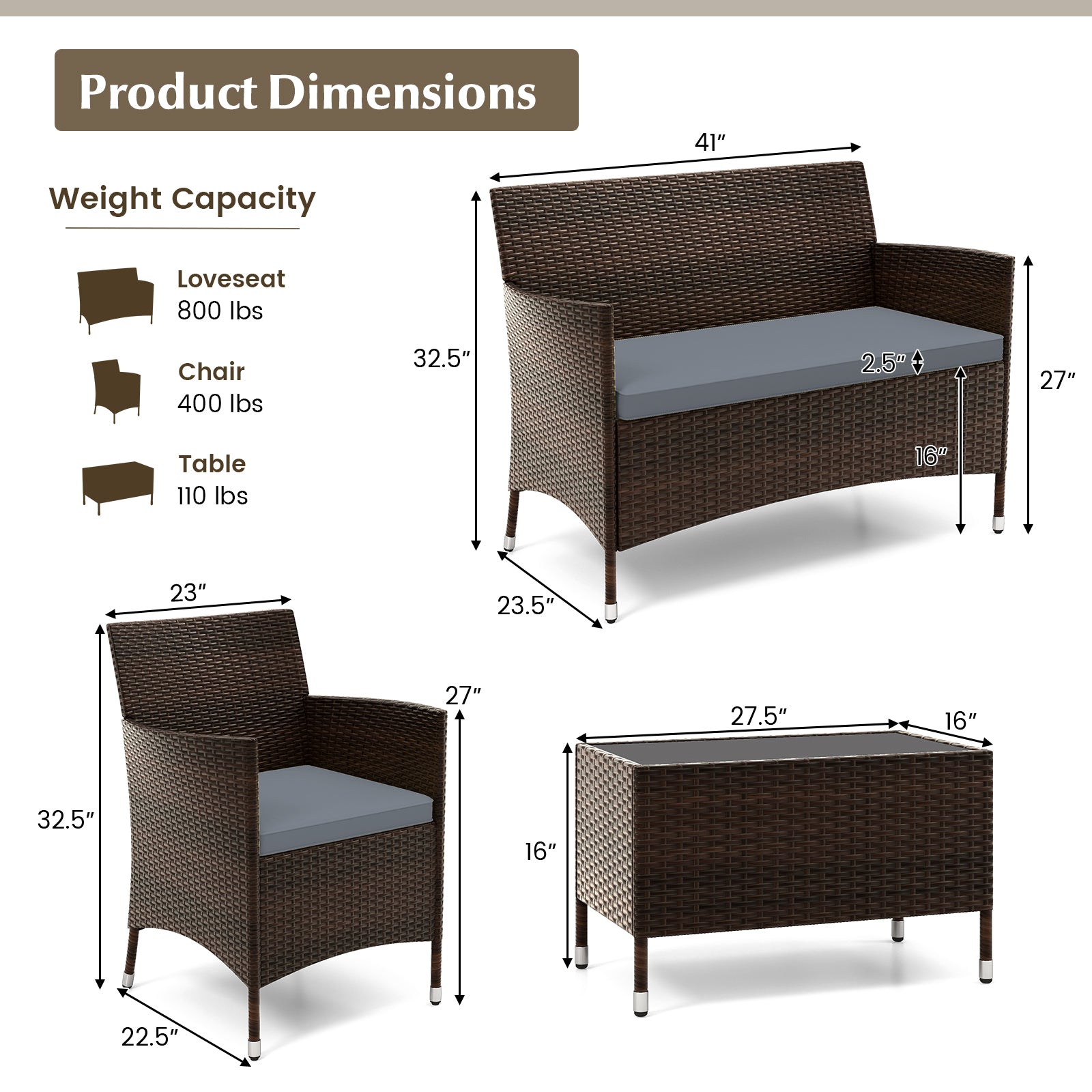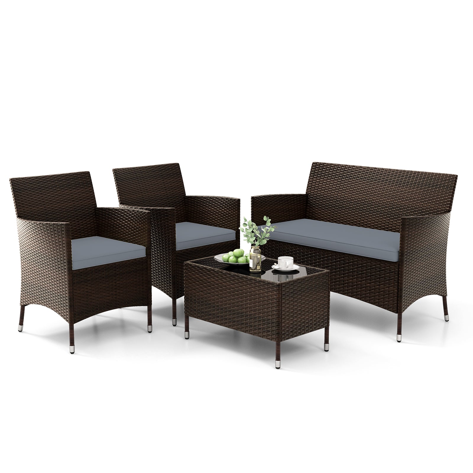 4 Pieces Comfortable Outdoor Rattan Sofa Set with Glass Coffee Table-Gray