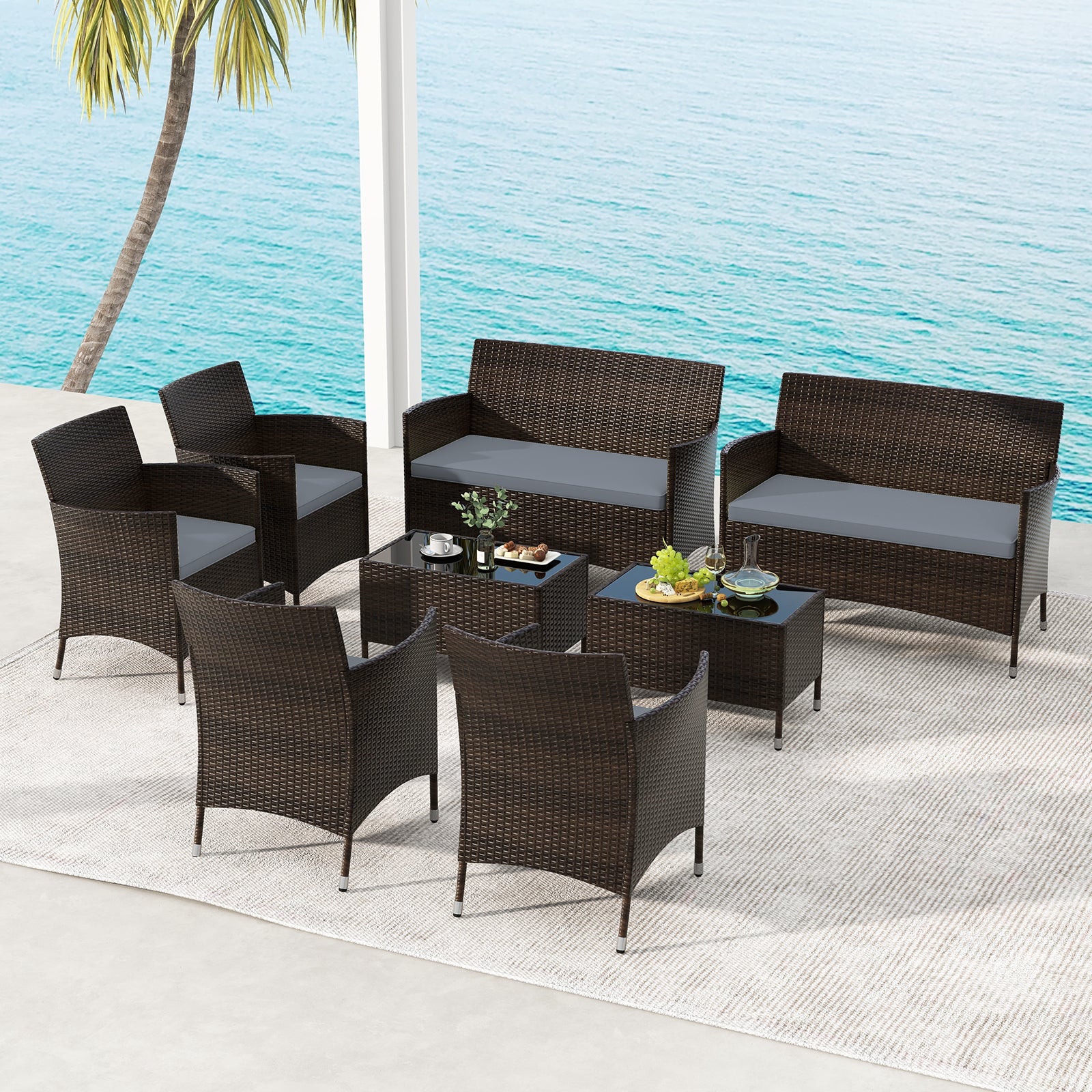 Made of a sturdy steel frame the set is durable enough to be your long-term choice. Exquisite rattan with strong toughness will also give you good touch. The soft sponge cushion can also help to fully relax your body. This wicker outdoor furniture set can match any home style which is a good choice for living rooms porches poolsides or gardens.
