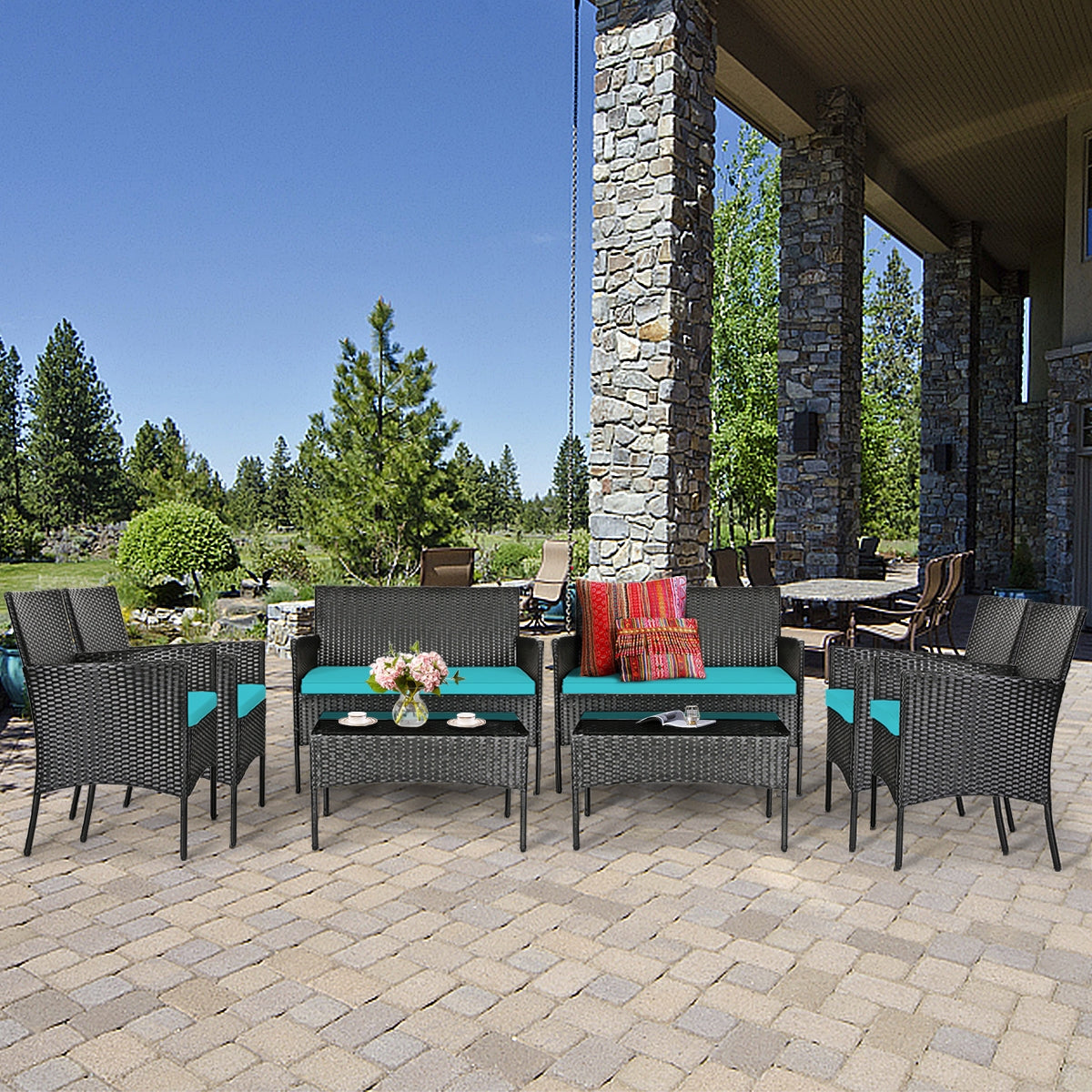 4 Pcs Patio Rattan Cushioned Sofa Furniture Set with Tempered Glass Coffee Table-Turquoise