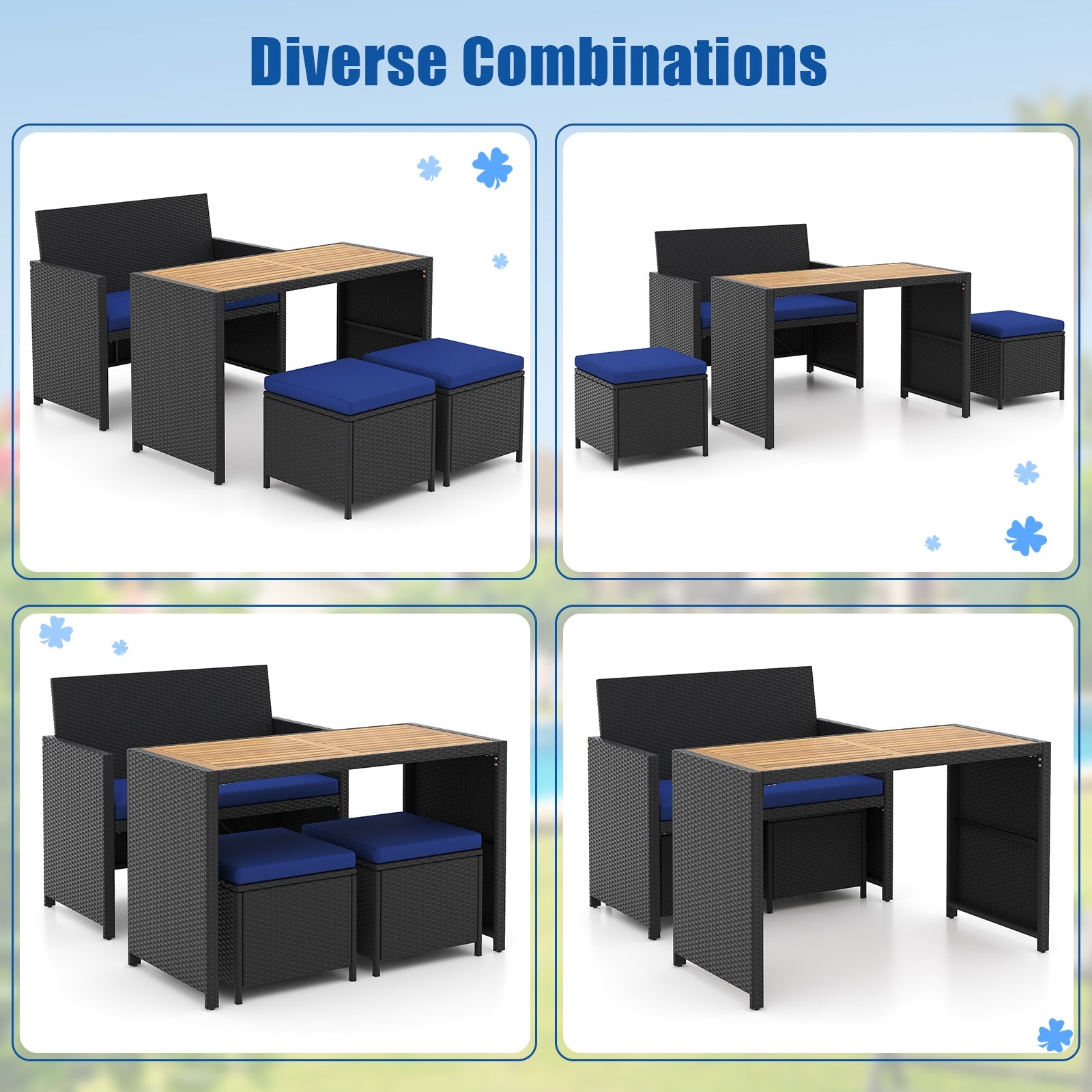 4 Piece Outdoor Dining Set with Wood Topped Dining Table Rattan Loveseat Chair and 2 Ottomans-Navy