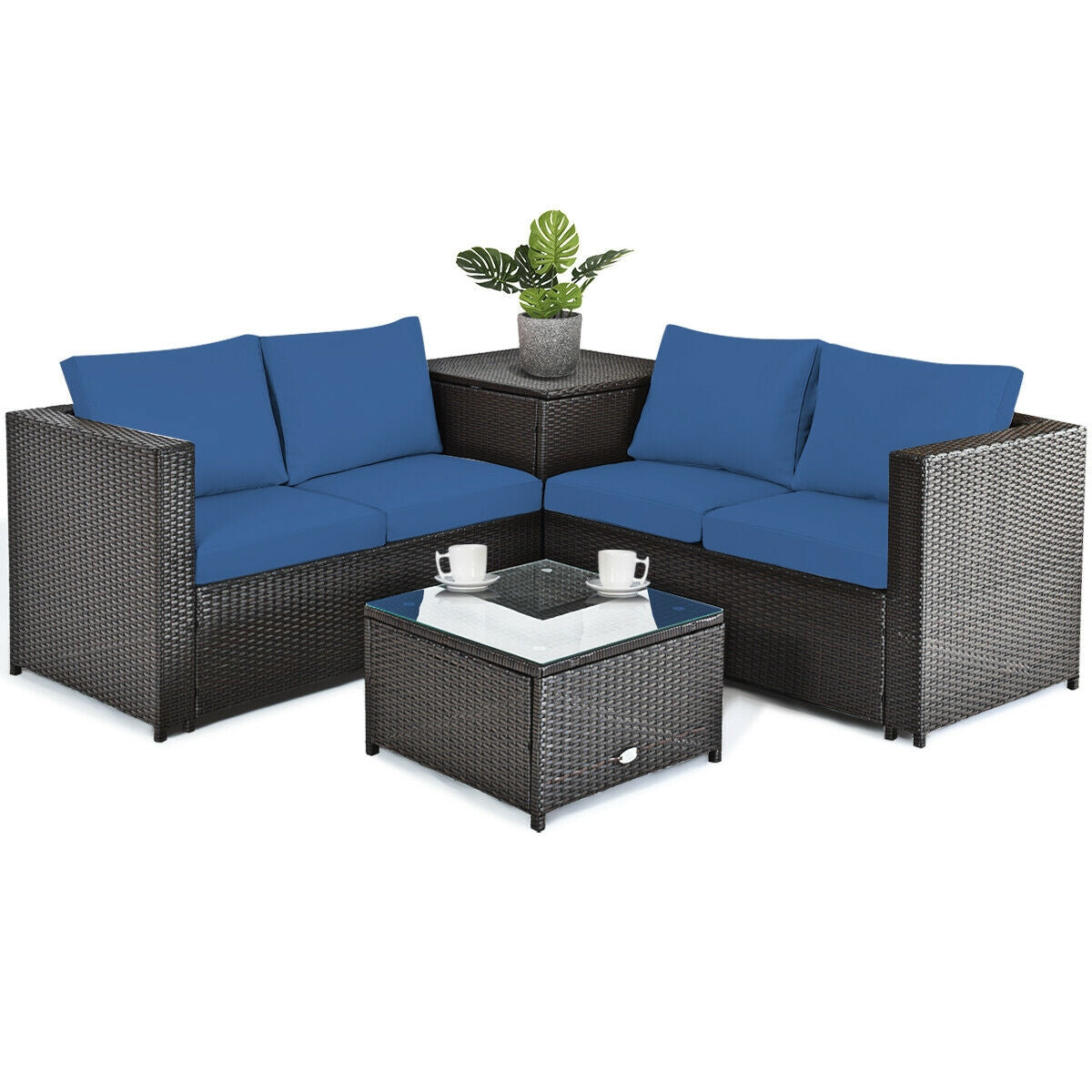 4 Pieces Outdoor Patio Rattan Furniture Set with Cushioned Loveseat and Storage Box-Navy
