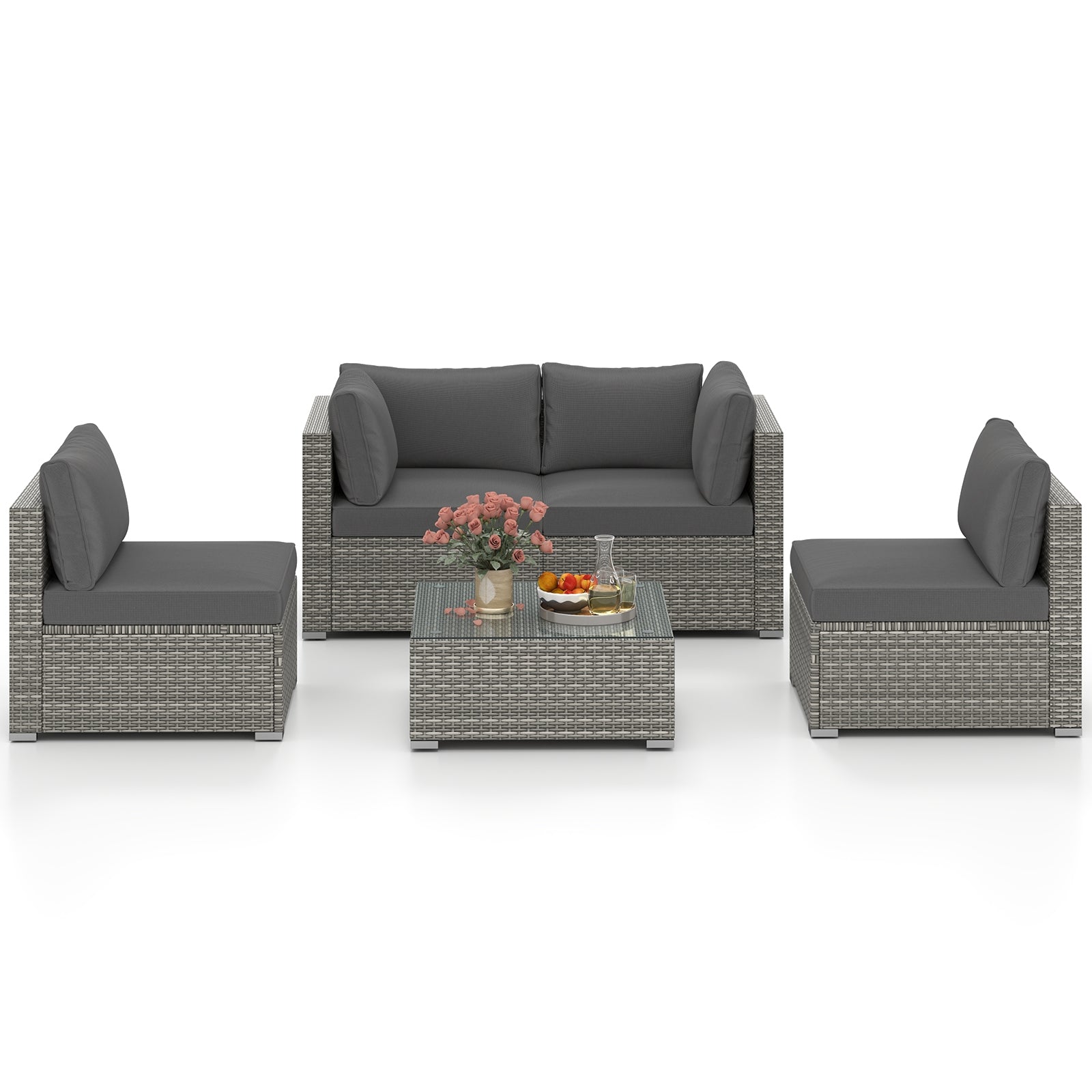 5-Piece Outdoor Patio Sectional Sofa Couch and Glass Coffee Table with Cushions-Gray