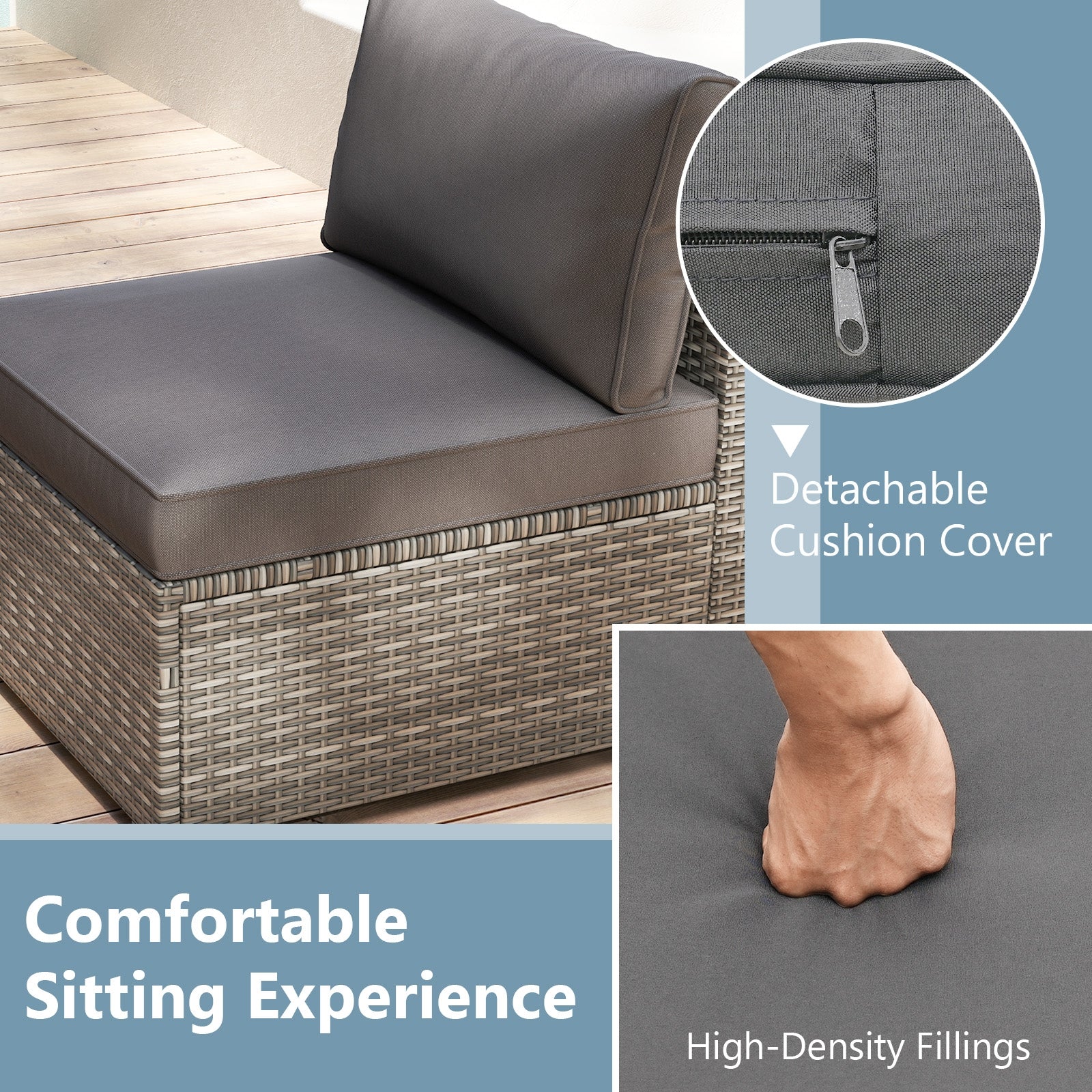 ● Comfortable Sitting Experience: The outdoor sectional furniture set is equipped with thick cushions featuring high-density fillings and soft pillows providing you with a comfortable seating experience. The detachable cushion covers make cleaning and maintenance a breeze.