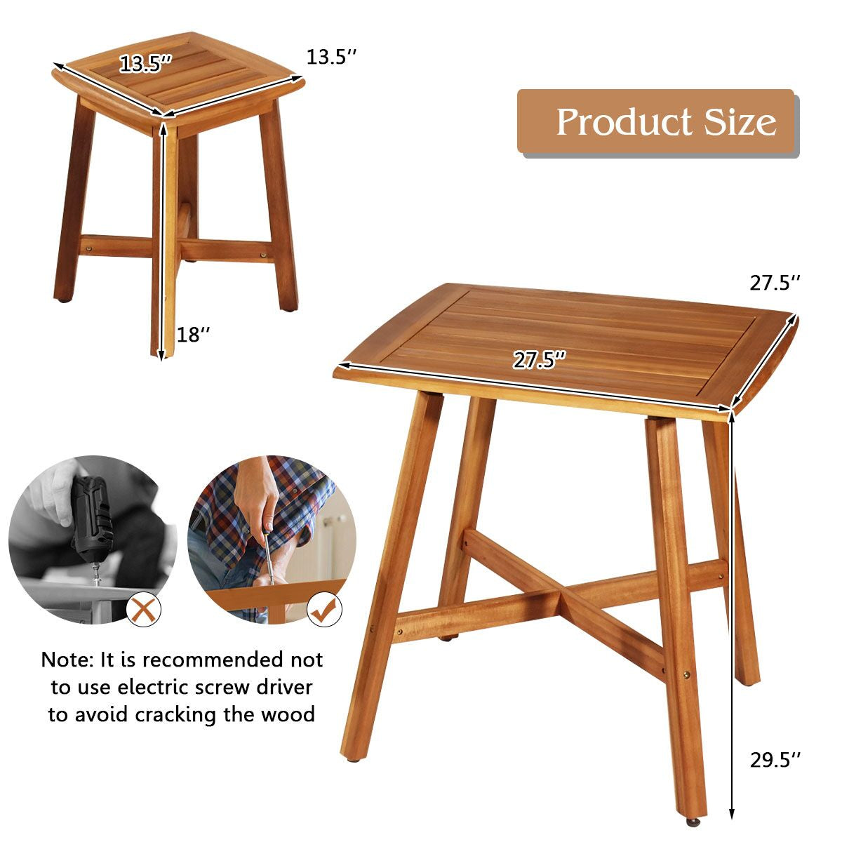 ● Premium Acacia Wood Construction: Made of 100% solid acacia wood this outdoor dining set is durable and sturdy which can be used for a long time without easily deforming. The cross bar at the bottom of table and stool is tightly screwed enhancing the stability and provide you with high weight capacity.