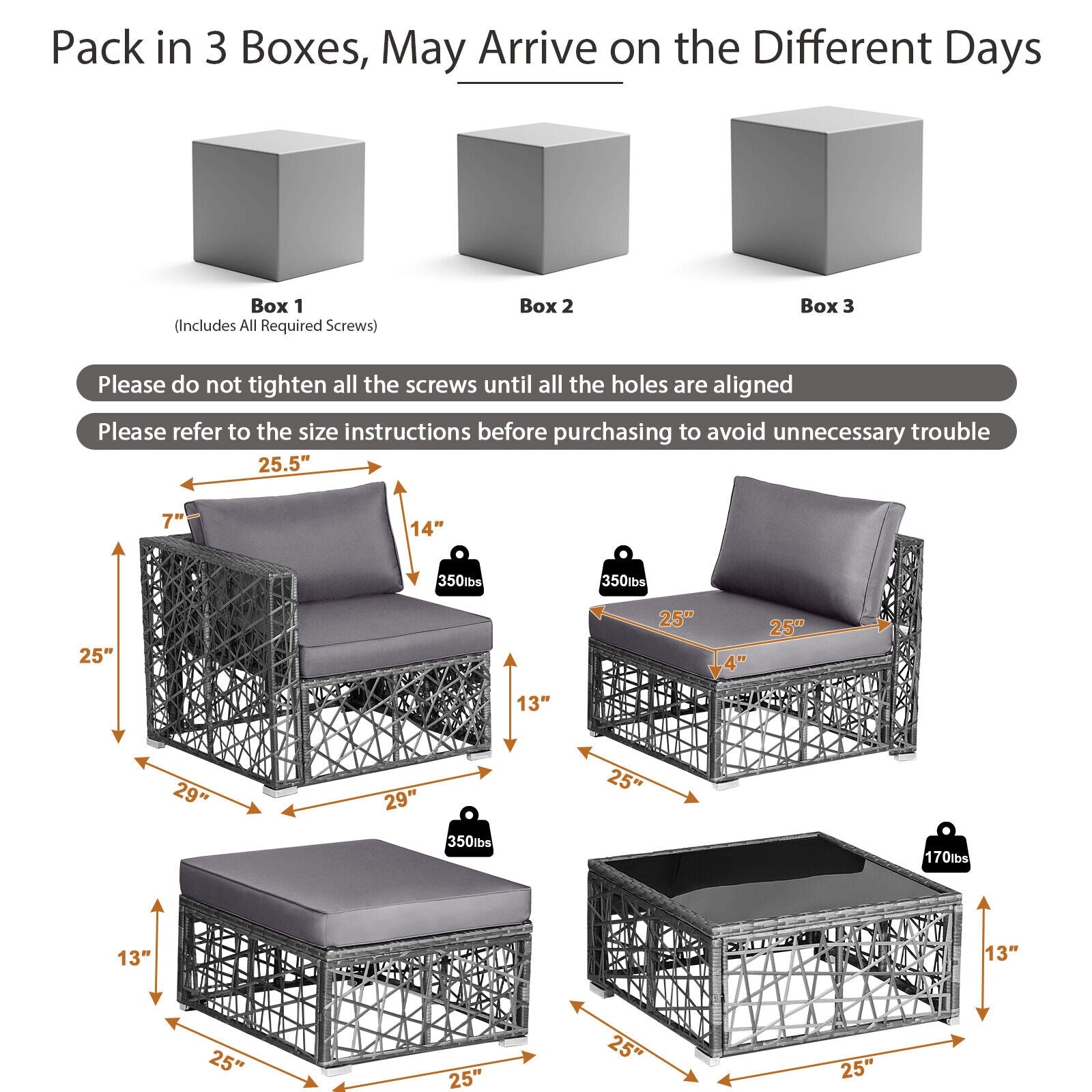 ● Shipping Information: This 5-piece outdoor furniture set is packed in 3 boxes that may arrive on different days. And box 1 includes all required screws. Please install after receiving all packages. During assembling please do not tighten all the screws until all the holes are aligned.