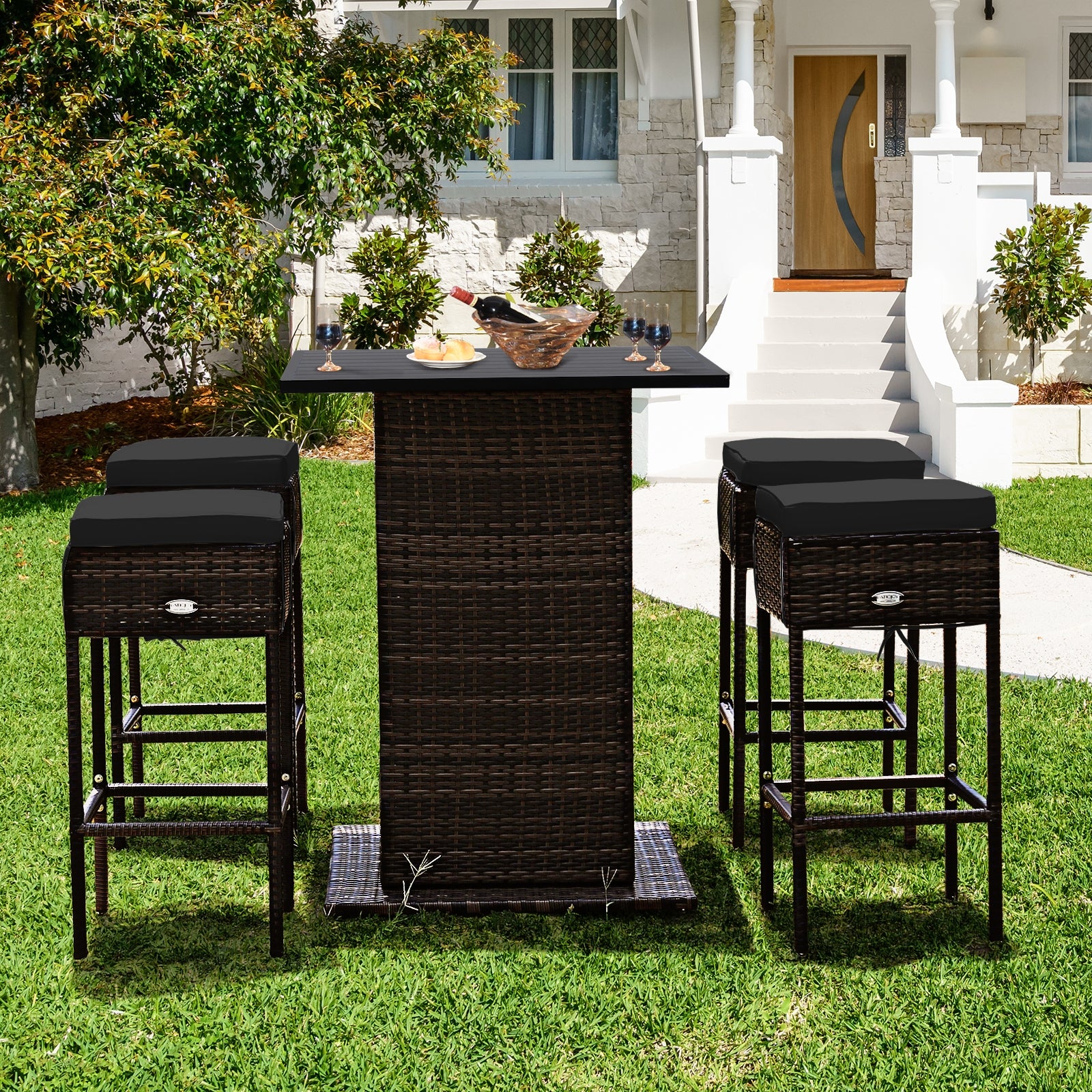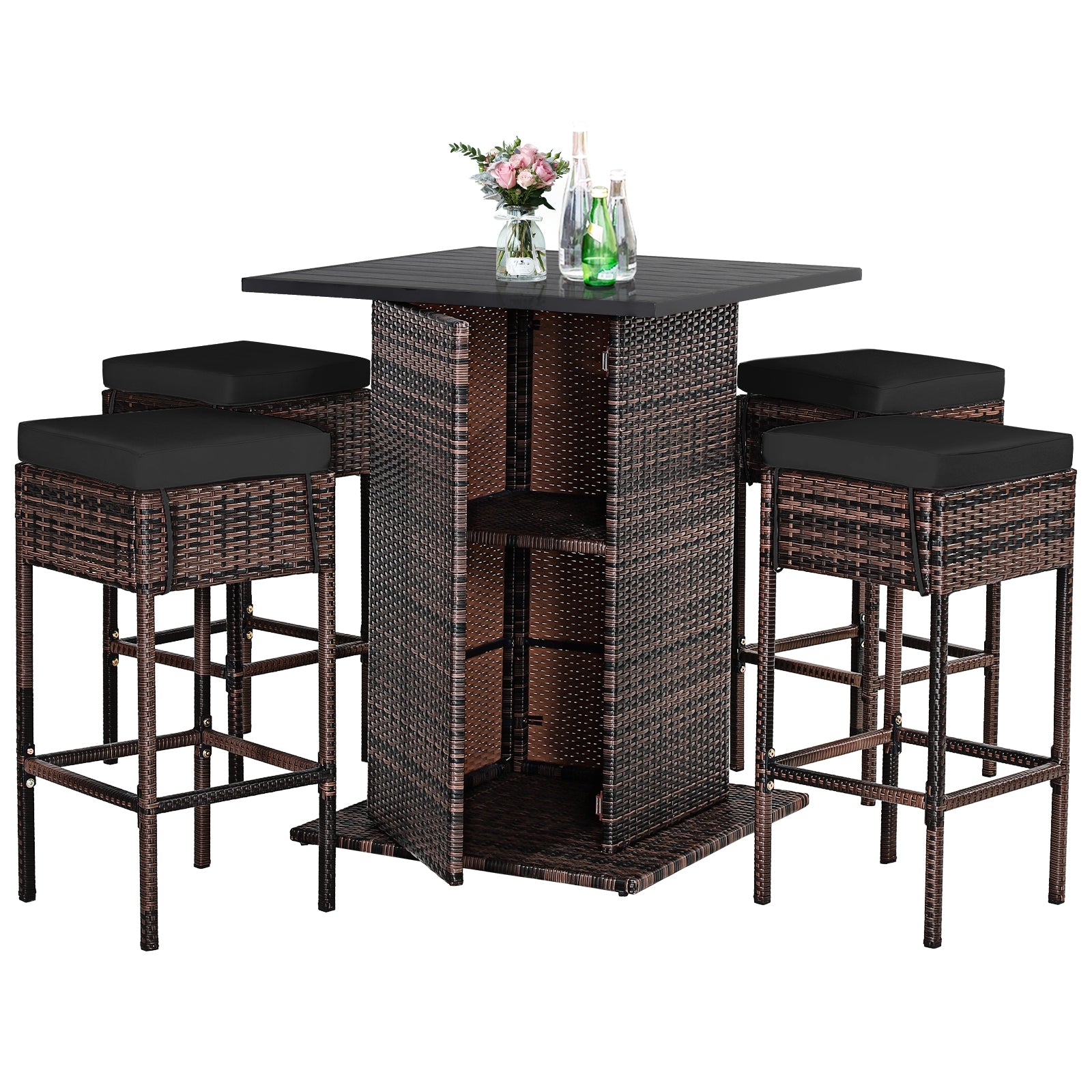 5 Pieces Patio Rattan Bar Furniture Set with Cushions and Hidden Storage Shelf-Black