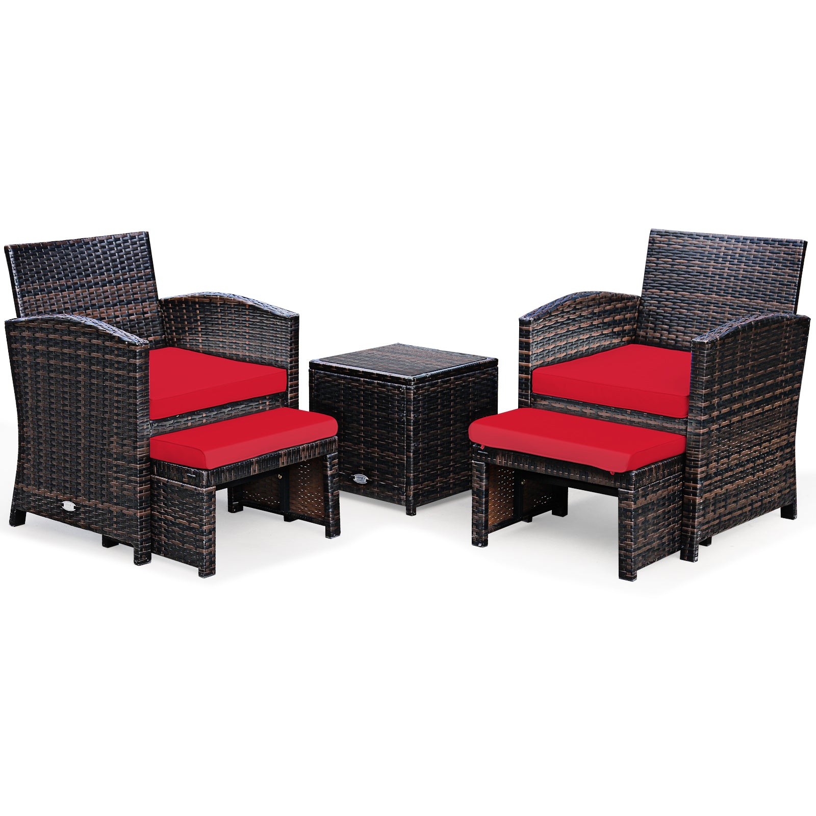 5 Pieces Patio Rattan Furniture Set with Ottoman and Tempered Glass Coffee Table-Red