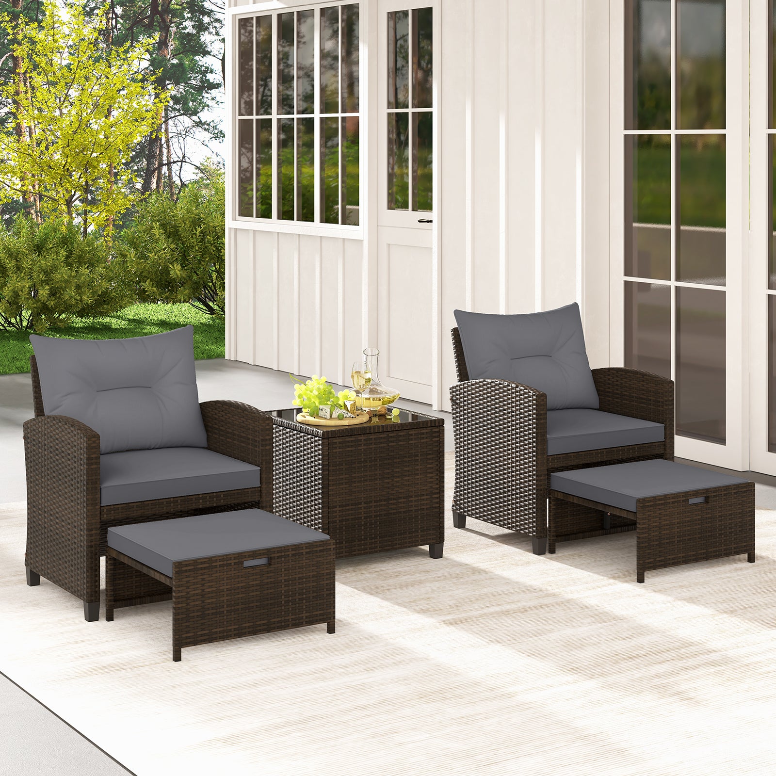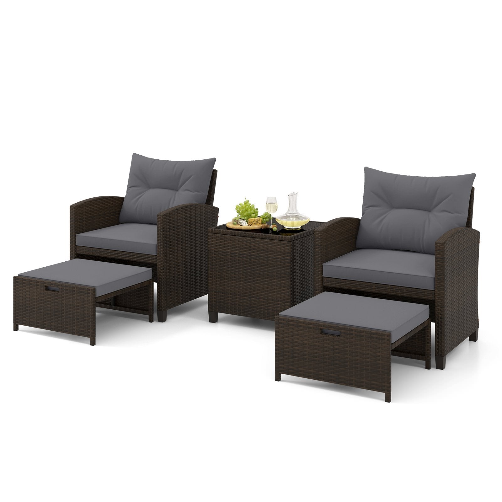 5 Pieces Patio Rattan Furniture with 2 Ottomans and Tempered Glass Coffee Table-Gray