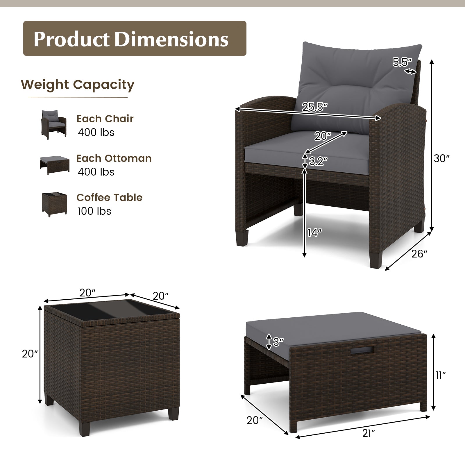 ● Awesome Relaxing Choice: As a perfect blend of coziness and elegance this 5-piece outdoor wicker set will be an awesome addition to backyard poolside front porch and so on. Dimension of chair: 26" x 25.5" x 30" (L x W x H). Dimension of ottoman: 21" x 20" x 11" (L x W x H). Dimension of coffee table: 20" x 20" x 20" (L x W x H).
