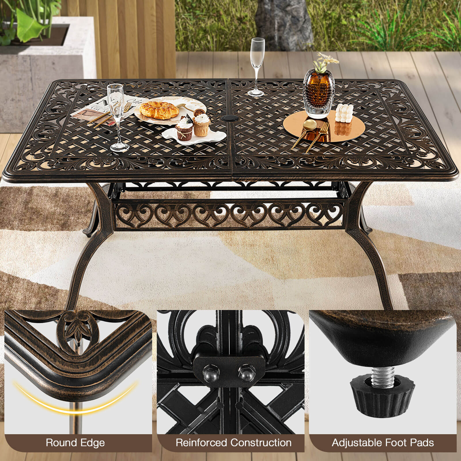 59 Inch Aluminum Patio Dining Table with Umbrella Hole fot 6 Persons-Bronze