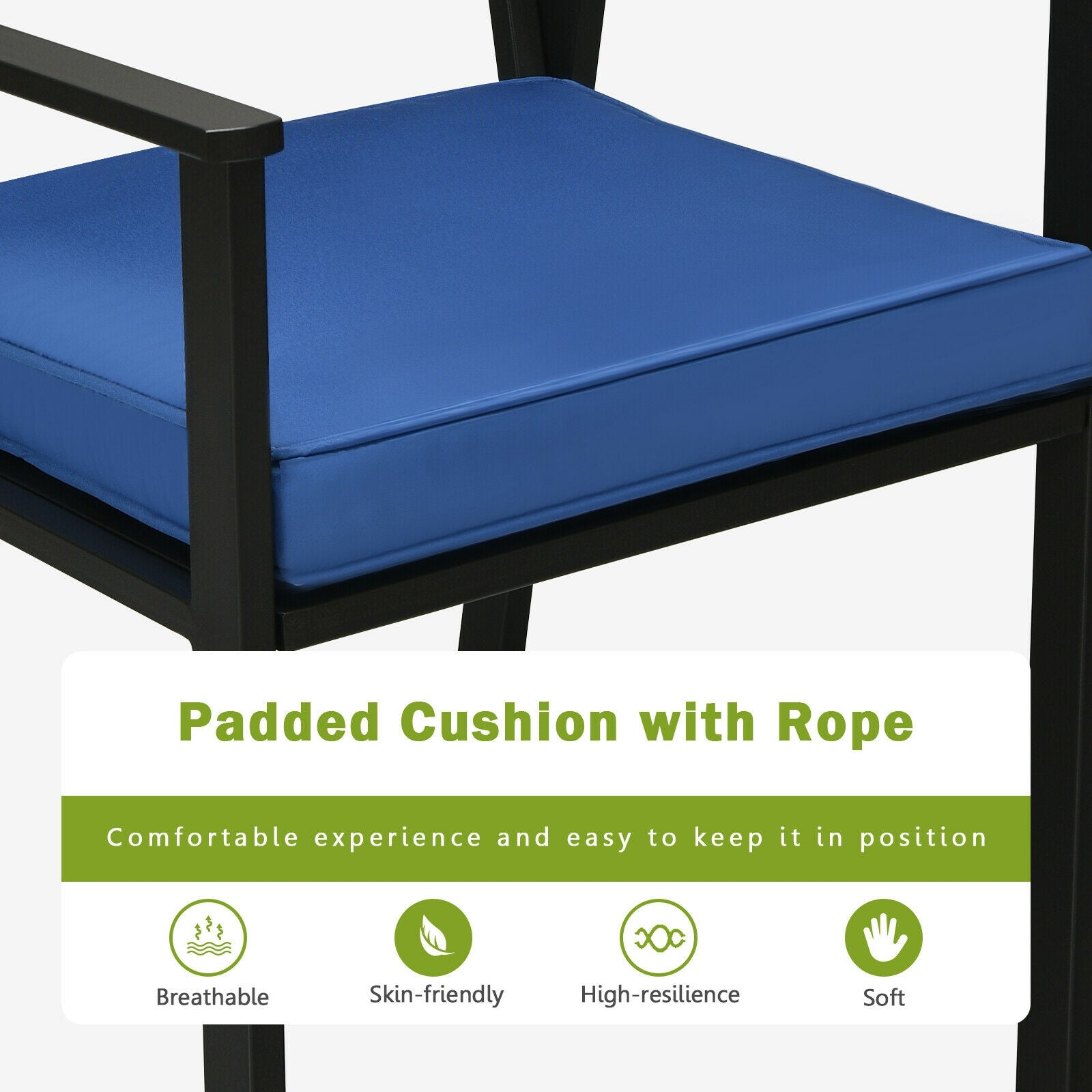 ● Soft Cushion with Fixed Ropes: The seat cushion filled with a high-density sponge is 3" thick so it increases the softness and provides excellent comfort. In the meantime the seat cushion with ropes can easily fix the seat cushion on the seat without worrying about frequent slipping during use.
