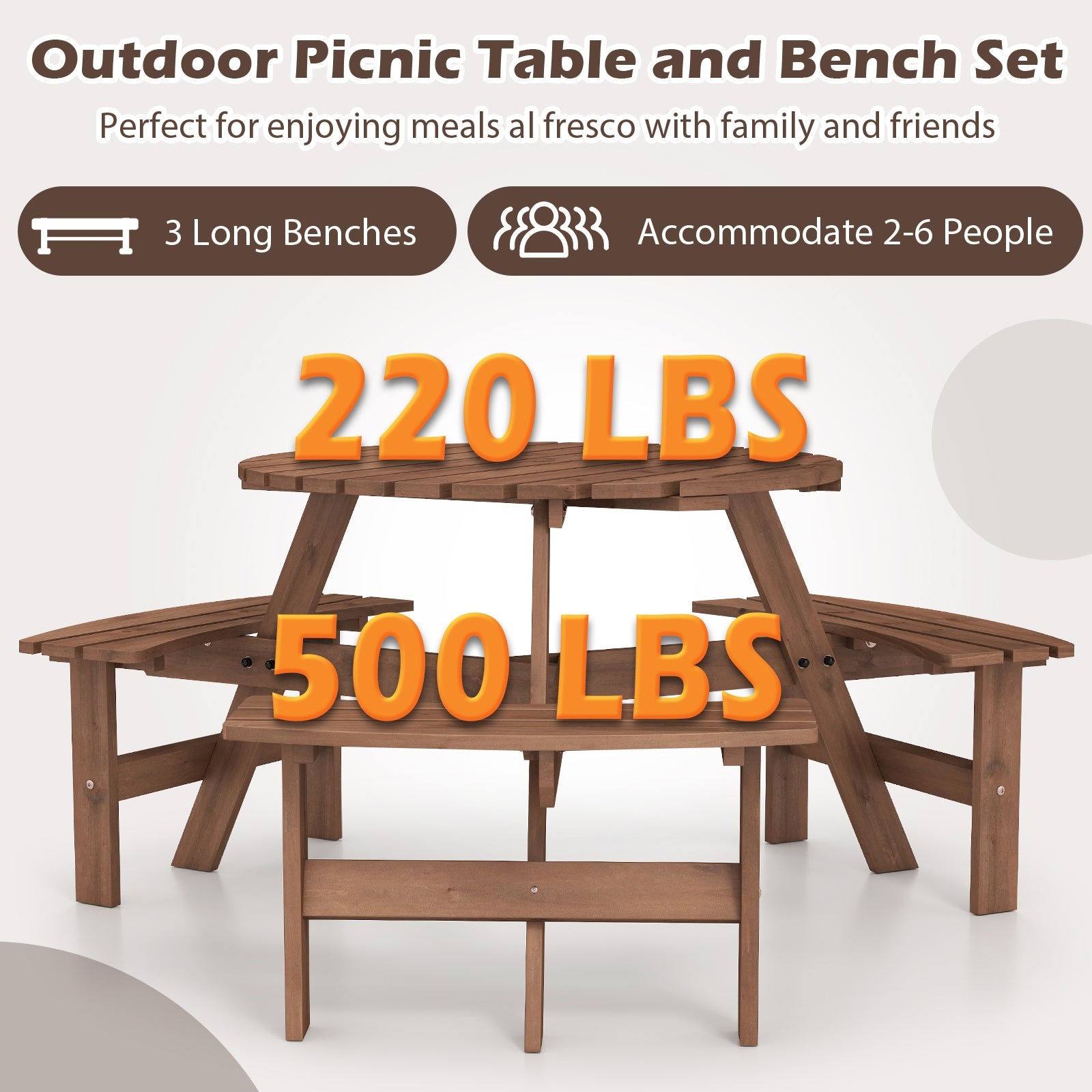 6-Person Round Picnic Table Set with 3 Built-in Benches and Umbrella Hole-Brown