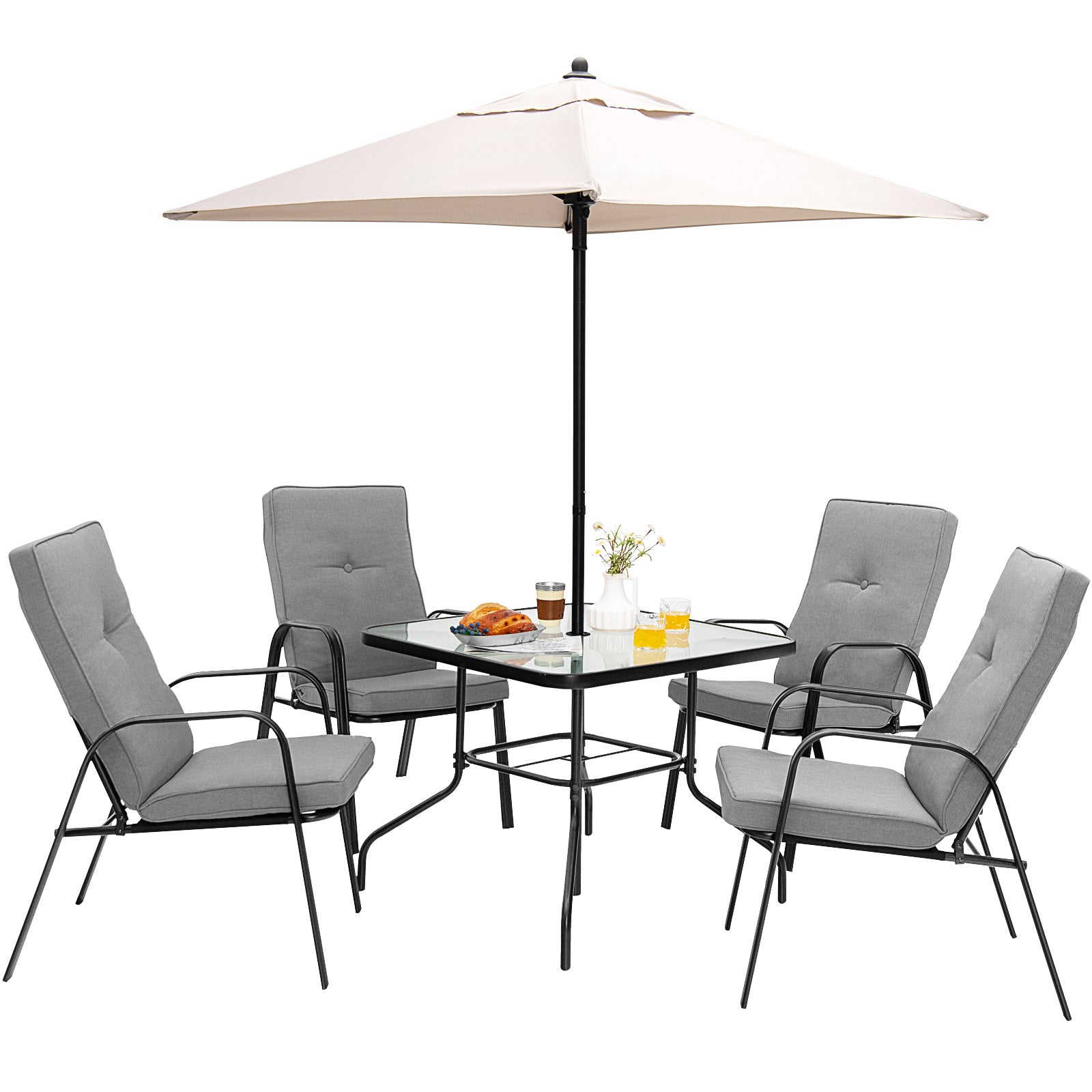 ● Perfect Selection for Outdoor Life: This outdoor furniture set consists of 1 square glass table 4 chairs and an umbrella creating a cozy space for relaxing dining and playing. You can place this 6-piece furniture set on your patio poolside backyard and other places to entertain your friends or enjoy happy family-gathering time.