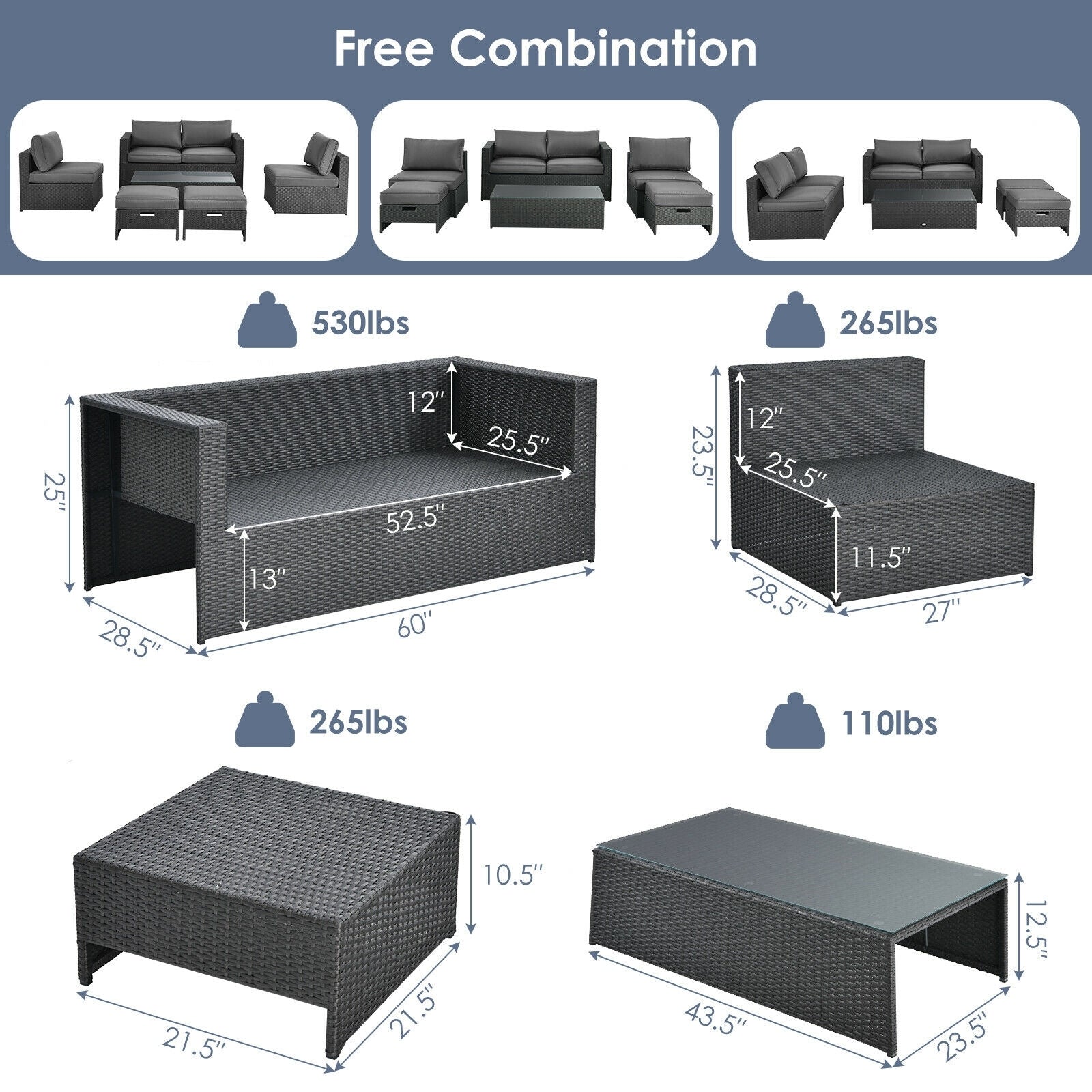 ● No Assembly Needs and Free Combination: This patio set has been fully assembled. The patio set includes: 1 x loveseat (60" x 28.5" x 73") 2 x armless sofas (27" x 28.5" x 23.5") 2 x ottomans (21.5" x 21.5" x 10.5") and 1 x coffee table (43.5" x 23.5" x 12.5"). There is no limit of combination and you can use each piece separately.