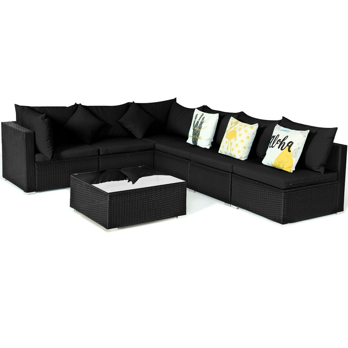 7 Pieces Outdoor Sectional Wicker Patio Furniture Sofa Set with Tempered Glass Top and Softy Cushions-Black