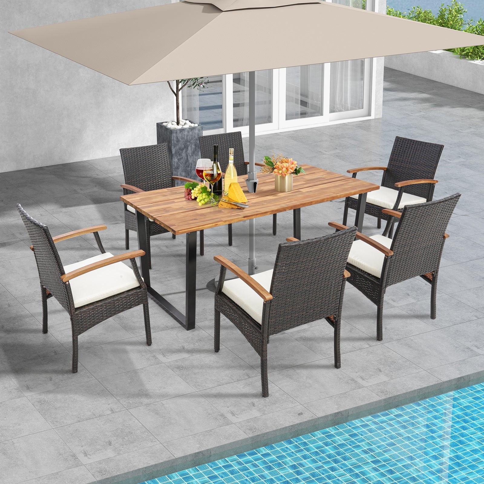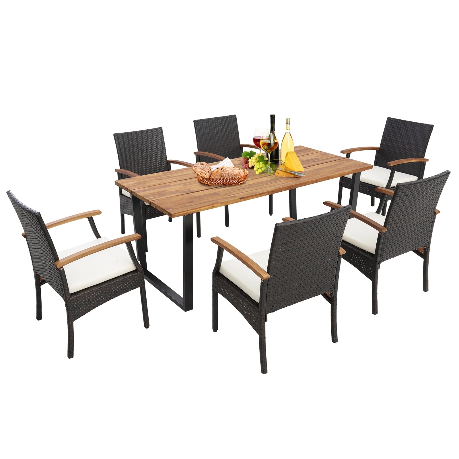 7 Pieces Outdoor Wicker Chair and Dining Table Set-Wood Handrail