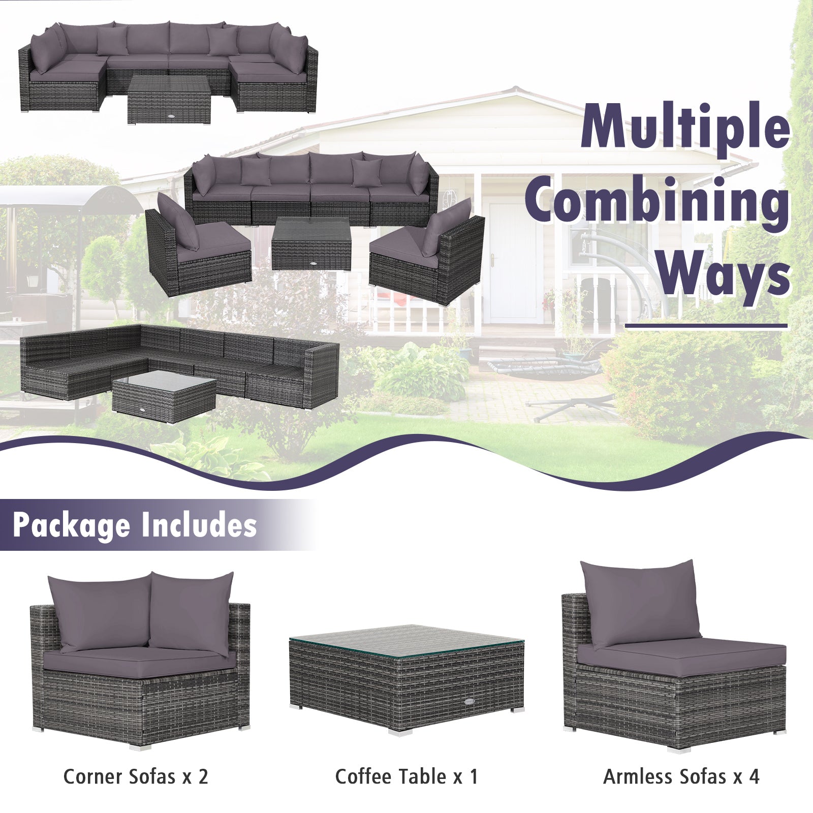 ● Rearrange As You Like: This 7-piece patio sectional sofa set comes with various combinations which not only meet your different needs but fit your various places such as patio garden poolside and backyard to enjoy outdoor leisure time anytime anywhere. And 10 fastener clips keep the seats securely connected and in place.